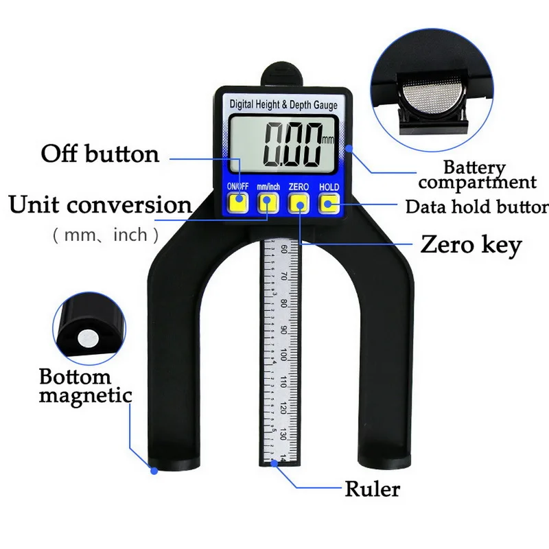 -- Единицы измерения: этот компактный датчик включает цифровую индикацию в метрической или императорской системе. Мм и дюйм могут быть легко изменены для удовлетворения различных потребностей измерения. -Четкое чтение: легко читается с цифровым дисплеем с большими цифрами, легко и быстро. -- Функция удержания данных: она может удерживать значение измерения при использовании, что позволяет вам полезно и легко читать. -- Магнитные ножки: удерживает датчик на металлической поверхности. -- Применение: Может использоваться для установки пильного диска, измерения высоты и глубины для деревообработки, таблицы маршрутизатора и многого другого. -- Портативный: маленький размер идеально помещается в сумке для инструментов, это не занимает много места.
