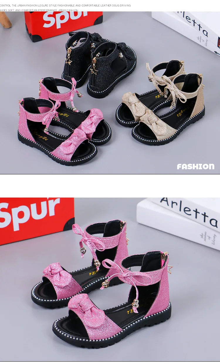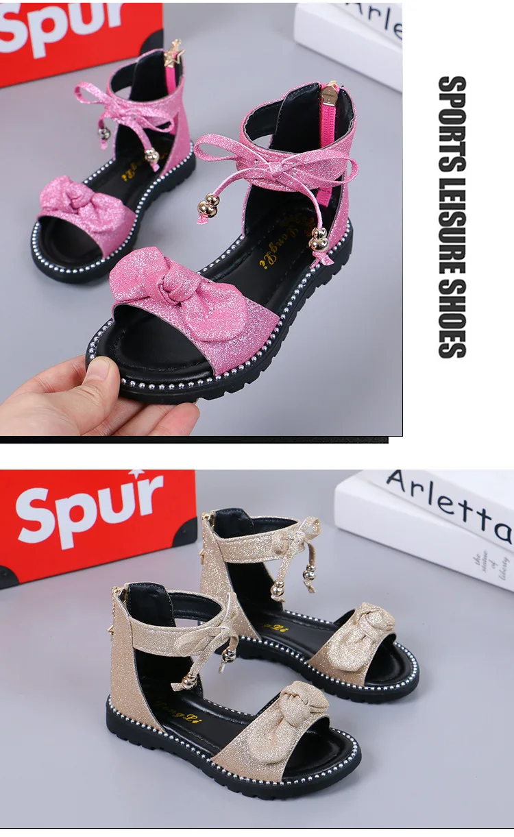 2022 летние сандалии для девочек; Пляжные модные туфли принцессы с бантом для танцев; Детские туфли-гладиаторы на плоской подошве; Розовые От 3 до 12 лет
