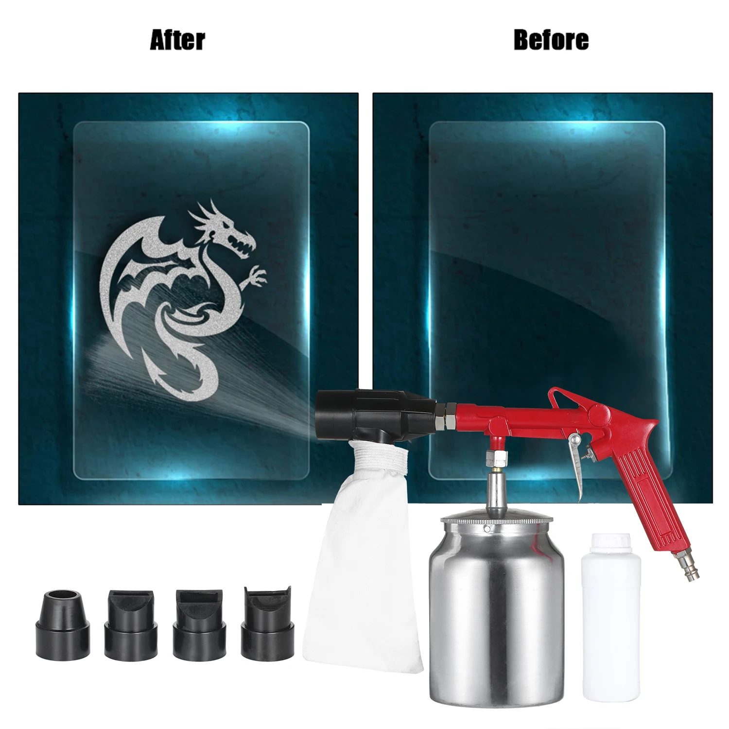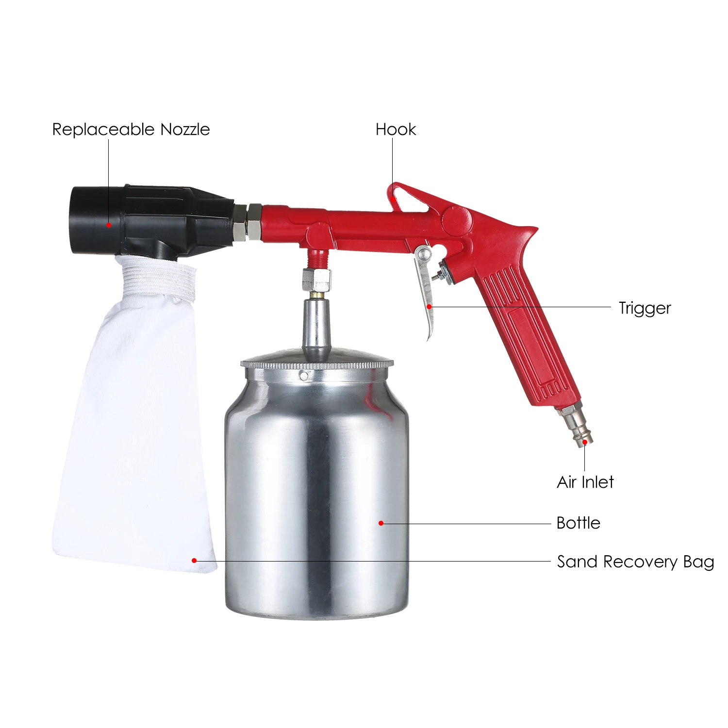Воздушный Пескоструйный пистолет поставляется с бутылкой пескоструйного абразивного песка и разработан с мешком для пескоструйной обработки, таким образом, вы можете использовать его повторно.