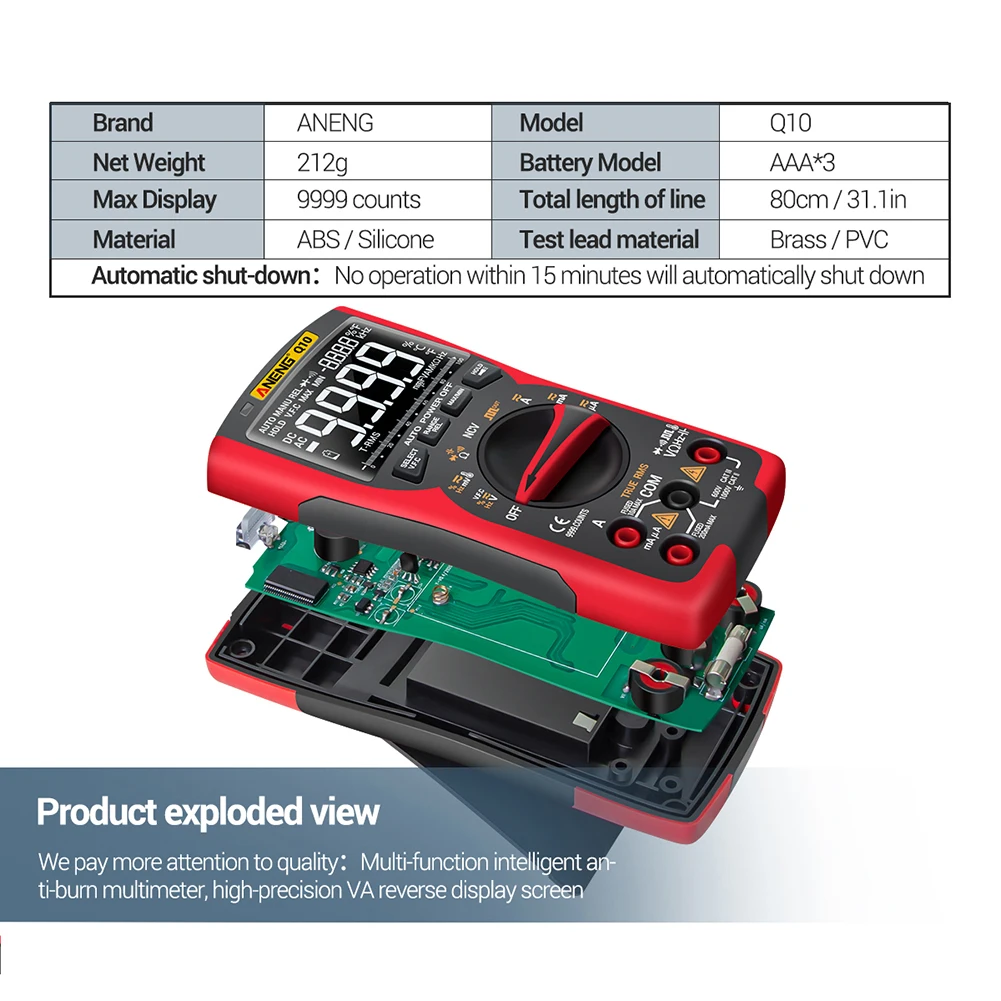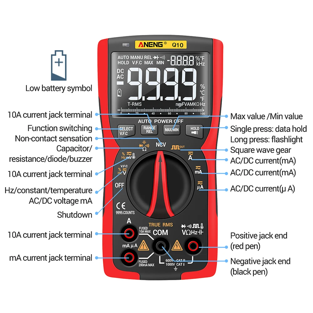 ** Многофункциональность: Широкий диапазон испытаний для переменного/постоянного напряжения, постоянного тока, сопротивления, зуммера, тестовых диодов, hFE и температуры.