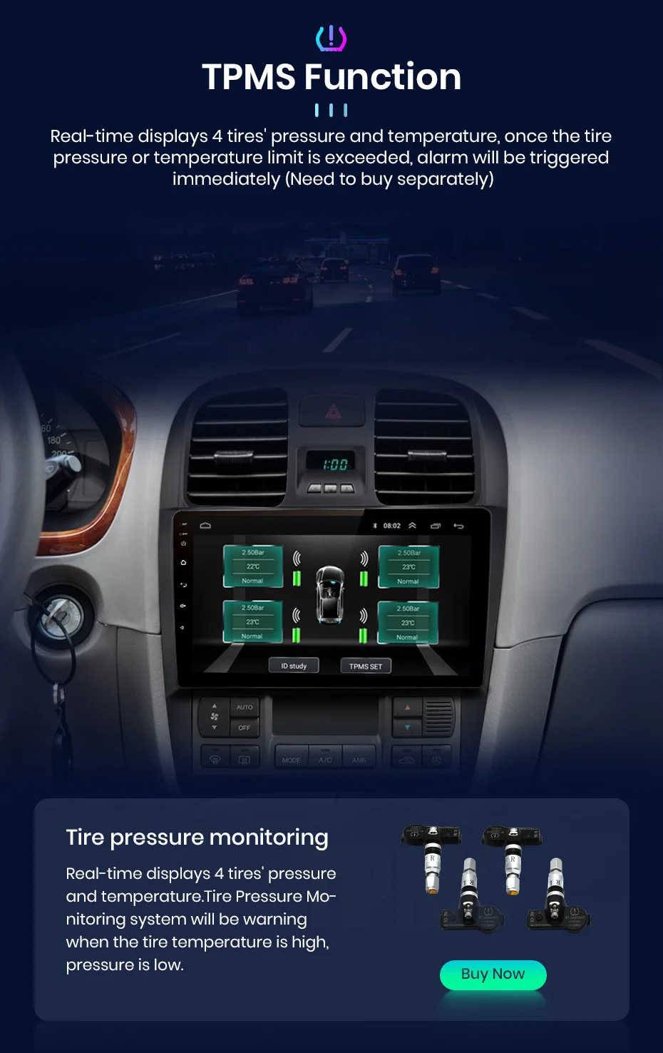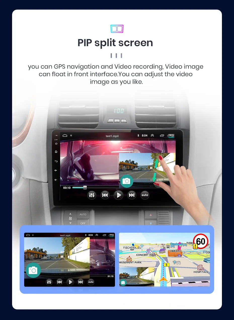 9-inch 2.5D capacitive screen + 1.2 GHz quad-core processor + DDR3 1 GB (2 GB optional) Flash + 16 GB memory (32 GB optional) + Built-in Wi-Fi (4 GB network optional) + GPS navigation (map update, only support for Junsun brand) + steering wheel control + mirroring + Bluetooth + built-in microphone + FM / AM + RDS (optional) + support for USB ADAS DVR function + Europe DAB function + 1080P Vedio Play + HD 1024 * 600 + pressure monitoring system tires