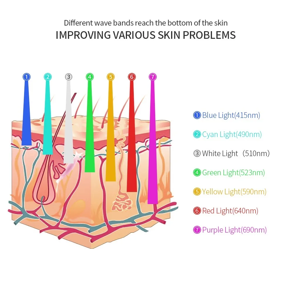 1. Красный (640 нм): омоложение и осветление морщин и акне 2. Синий (415 нм): удаляет акне, сбалансирует секрецию и улучшает жирную кожу 3. Желтый (590нм): улучшает эритему и покраснение 4. Зеленый (532 нм): успокаивающий эффект на чувствительную кожу 5. Фиолетовый: лечение акне и акне 6. Голубой: баланс секреции, стабилизации кожи и контроля жира