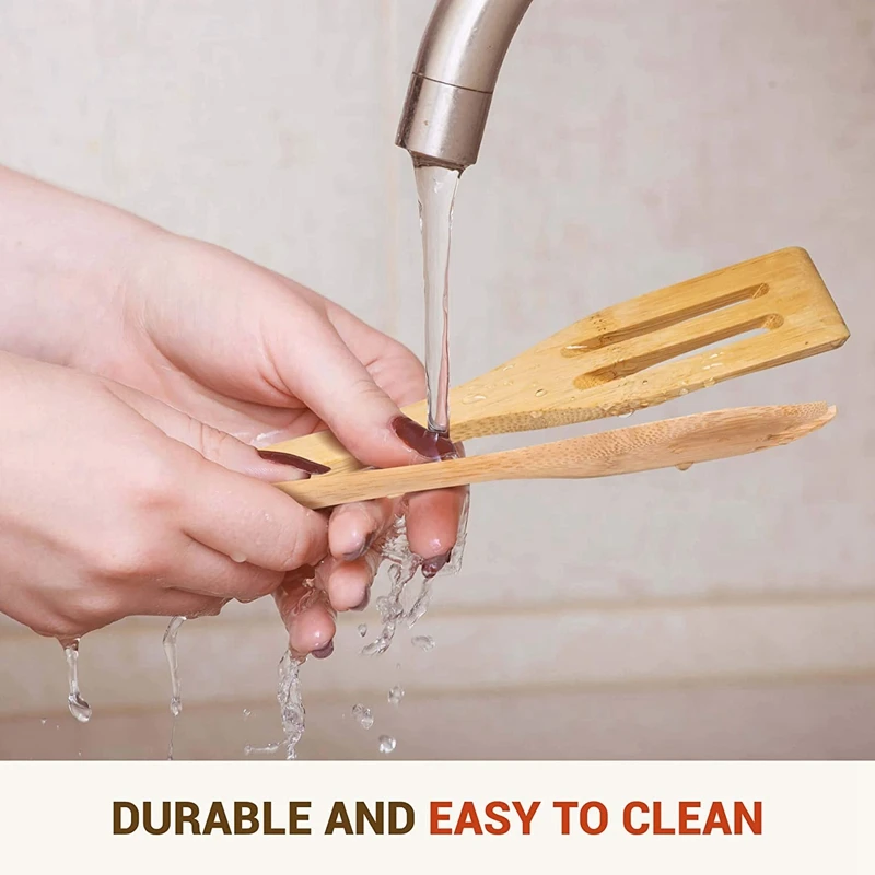 EASY TO CLEAN AND STORE: The wood spoons & spatulas are easy to clean, simply hand wash with warm soapy water, air dry thoroughly. Do not put them into the dishwasher and soak them. each bamboo handle has a utility hanging hole, the wood cooking utensils are stored easily in drawers or hang up.