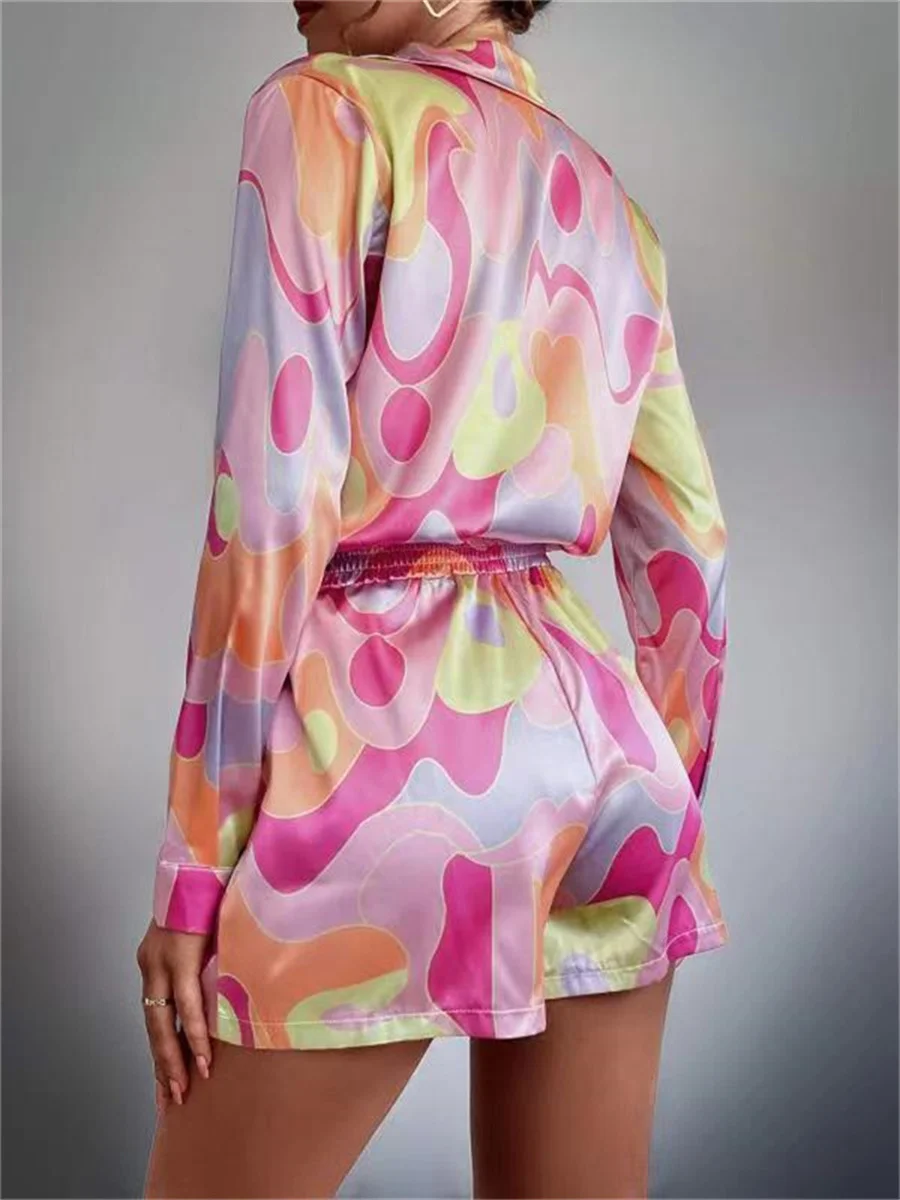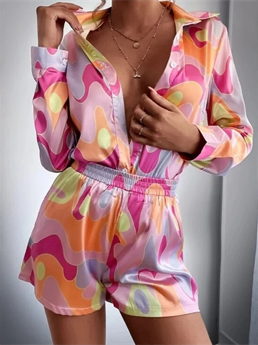 Таблица размеровРазмер (см)S Длина топа: 66 обхват груди: 96 рукав: 57 Длина брюк: 35 обхват талии: 62 обхват бедер: 102M Длина топа: 67 Обхват груди: 100 рукав: 58 Длина брюк: 36 обхват талии: 66 обхват бедер: 106L Длина топа: 68 Обхват груди: 104 рукав: 59 Длина брюк: 37 обхват талии: 70 обхват бедер: 110Размер (дюйм)S Длина топа: 25,98 Обхват груди: 37,80 рукав: 22,44 Длина брюк: 13,78 обхват талии: 24,41 обхват бедер: 40,16M Длина топа: 26,38 Обхват груди: 39,37 рукав: 22,83 Длина брюк: 14,17 обхват талии: 25,98 обхват бедер: 41,73L Длина топа: 26,77 Обхват груди: 40,94 рукав: 23,23 Длина брюк: 14,57 обхват талии: 27,56 обхват бедер: 43,31 Технические характеристикиКатегория: женский брючный костюм.Материал: полиэстер.Размер: S, M, L.Пол: женщин.Сезон: лето/весна.Горловина: отложной воротник.Рукав: длинный рукав.Рисунок: принт.Стиль: брючный костюм.Брюки: Короткая длина.Брюки с разрезом: эластичный пояс.Талия: высокая посадка.Цвет: розовый или зеленый. Примечания1. Пожалуйста, поймите, что могут быть небольшие отклонения.2. Из-за освещения и мониторов, есть небольшие различия между картинкой и реальным товаром. Посылка1 Топ и 1 штаны. ОбещаниеЕсли у продукта есть какие-либо проблемы с качеством, пожалуйста, свяжитесь с нами, мы поможем вам решить проблему как можно быстрее.