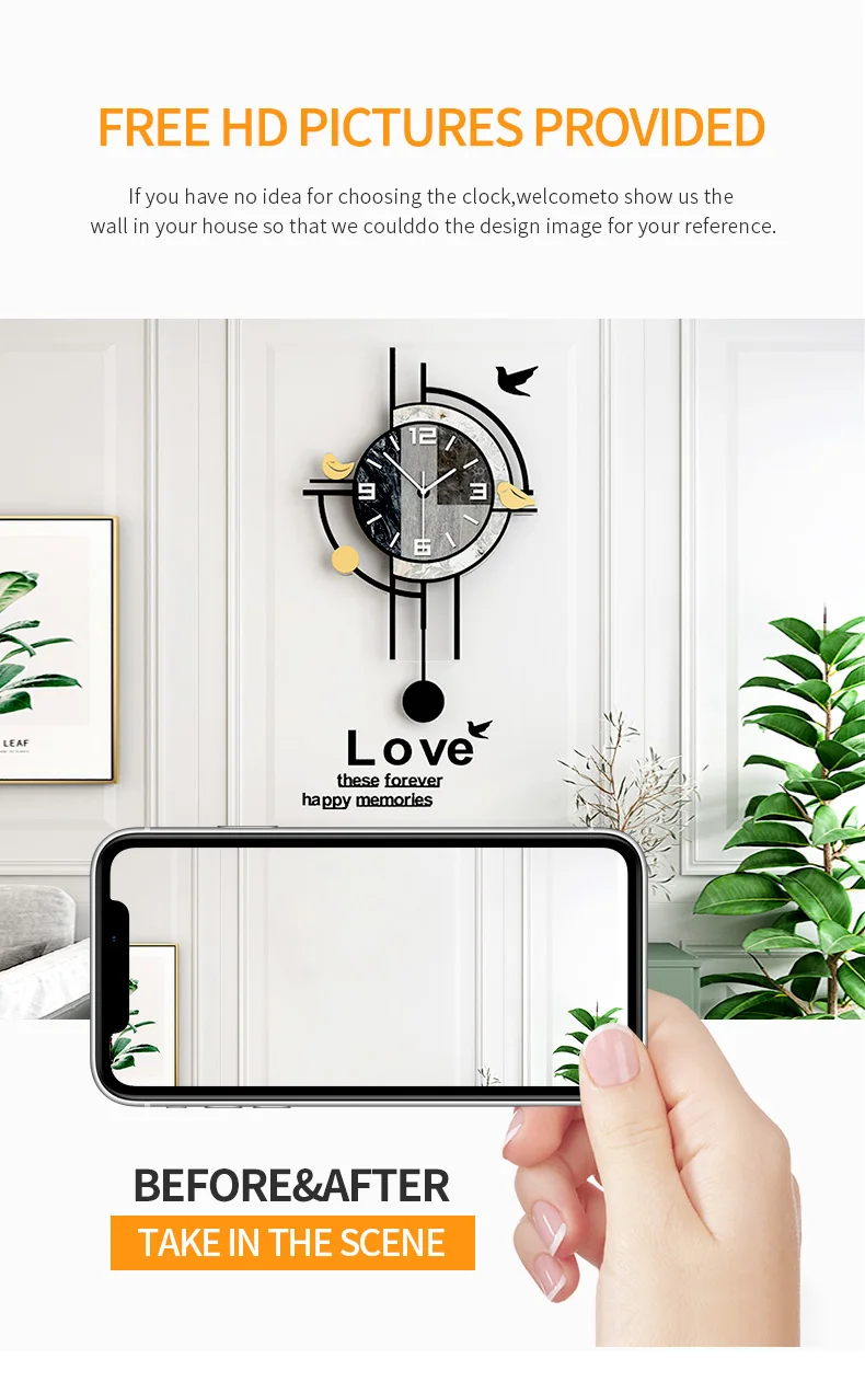 Если у вас нет идеи выбора часов, добро пожаловать, чтобы показать нам стену в вашем доме, чтобы мы могли сделать дизайнерское изображение для вашей справки.