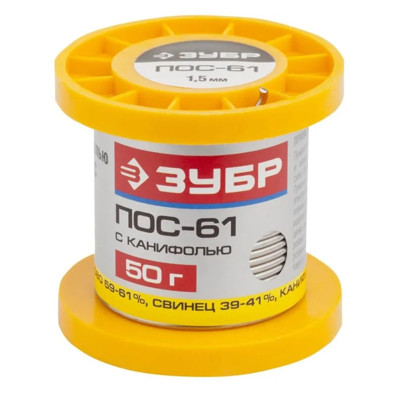 Припой ПОС 61 Зубр 55450 применяется для лужения и пайки элементов электро- и радиоаппаратуры, печатных схем, точных приборов с герметичными швами, где недопустим перегрев, пайка жести, обмоток электрических машин, монтажных элементов, моточных и кабельных изделий, радиаторов и листового цинка, оцинкованных деталей холодильных агрегатов, теплообменников, электроламп, кабельных оболочек, тонколистовой упаковки. Припой с 61% содержанием олова и 39% содержанием свинца оптимально подходит в случаях, когда элементы для спайки нельзя перегревать. Продукция предназначена для профессионального использования. Припой имеет высший уровень качества и прошёл спектральную и химическую проверку. Соответствует ГОСТ 21931-76.