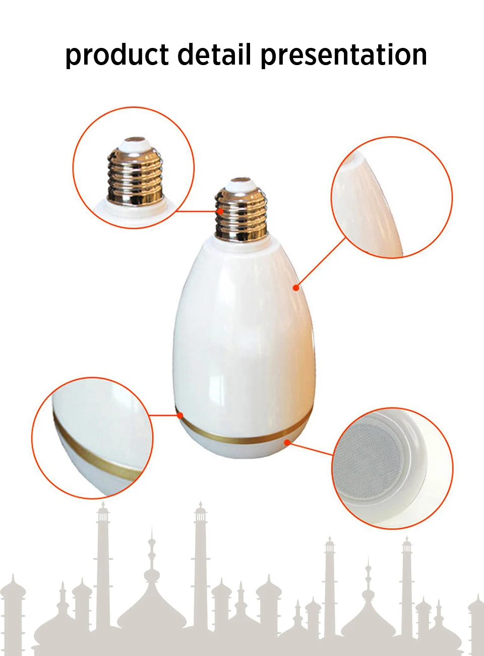 Номер моделиSQ302Brand NameEQUANTUOriginMainland ChinaMaterialPlasticFeatureNoneControlVolume controlControlPlaybackWaterproofNoChannels2 (2.0)CommunicationbluetoothImpedance4 OhmPower SourceDCRemote ControlYesDisplay ScreenNoCabinet MaterialPlasticPlayback Functionmp3PMPO18WOutput Power18WFrequency Range100Hz-20KHzSpeaker TypeSmartSupport Apt-xNoInput Power(W)<25 WSupport Memory CardYesSupport APPYesBatteryNoActive Noise-CancellationActiveVoice ControlNoNumber of Loudspeaker Enclosure1Audio CrossoverFull-RangeBuilt-in MicrophoneNoDisplay ScreenNoIntelligent Personal AssistantNONECodecsAACTotal Harmonic Distortion5Bluetooth Version4.0Sensivity78Acoustic enclosureHORNSabwoofer cabinet materialPlasticTweeter typeHORNTweeter materialOtherMid-range materialOtherWoofer/Widerange materialOtherMeasurement unit100000015Each pack1NameColorful LED Lights Bulb Quran SpeakerTranslation14 LanguagesTF Card8GBLED MAX Power8WSpecial FeatureWireless, Remote Control, APP ControlMain FunctionQuran reciter, Multi-languages Translations, MP3, BluetoothType1Quran Koran LearningType2Eid Al-Fitr Gift, Ramadan Gift, Eid Al-Adha GiftType3LightingRemote Control Range10-15 MetersReciter18 RecitersApplication ScenarioBedroom, Living Room, Dining Hall, Study RoomSize150mmX84mmBluetooth Distance15-20 metersLED Lights7 ColorsSpeaker Power10WLumens500LMMaterialAluminium body with ABS