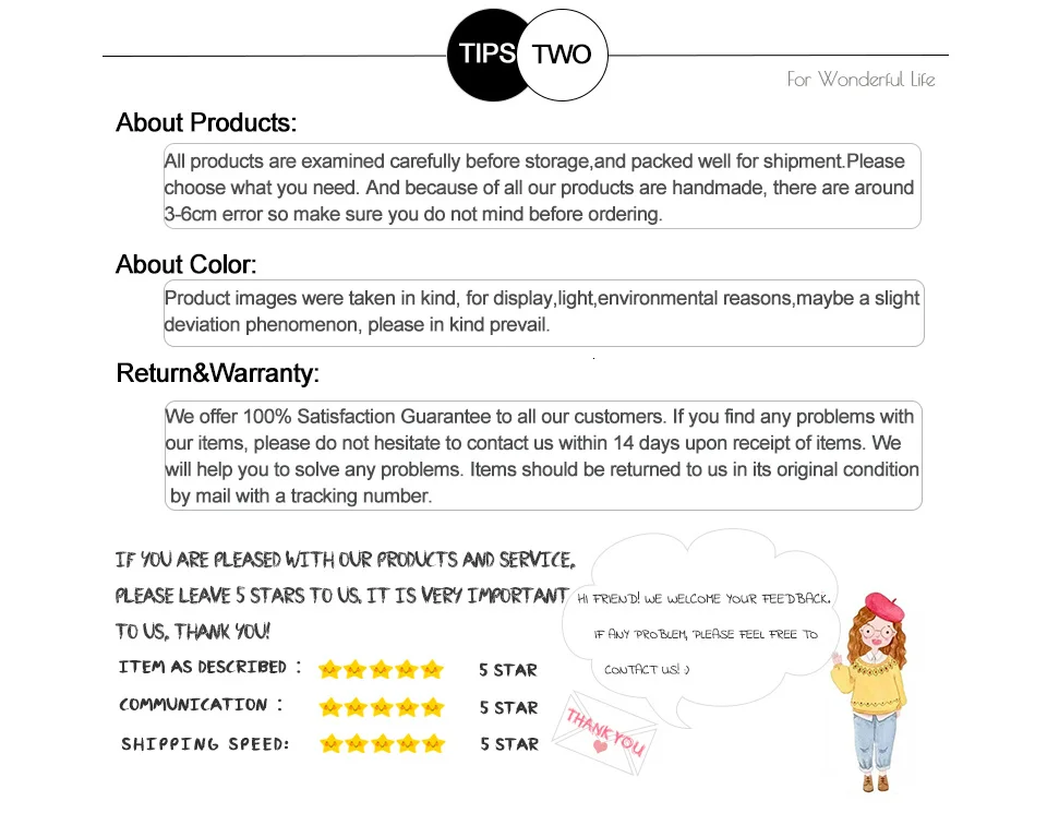1. Поскольку древесина имеет различную текстуру, мы не можем гарантировать, что каждый продукт точно такой же. И наш деревянный продукт 100% ручной работы, поэтому некоторые продукты могут иметь небольшие недостатки, надеемся на ваше понимание, спасибо!