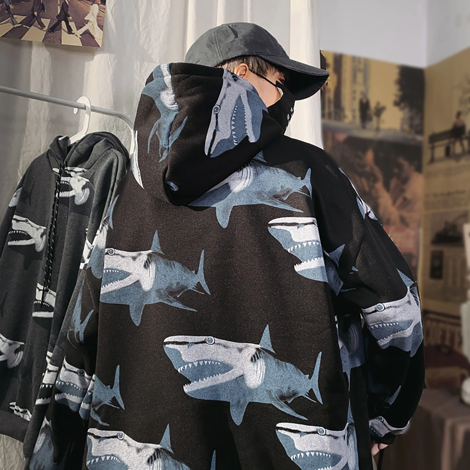 Особенности: шнурок, свободный крой, принт акулы, теплый