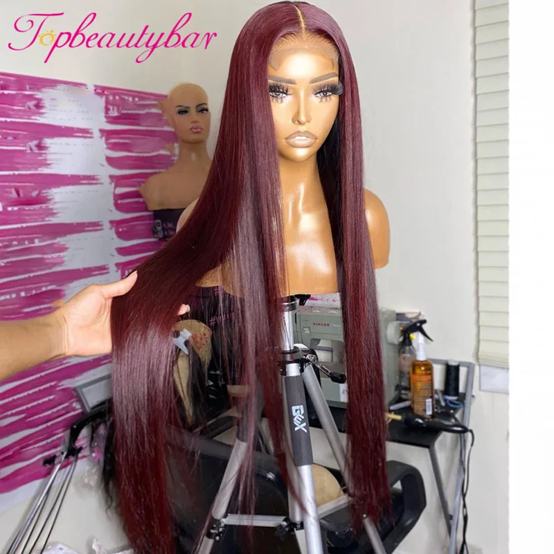 Прямые бордовые 13X 4 кружевные передние парики 99J цветные кружевные передние человеческие волосы парики для женщин 180% перуанские Реми кружевные парики preprucked