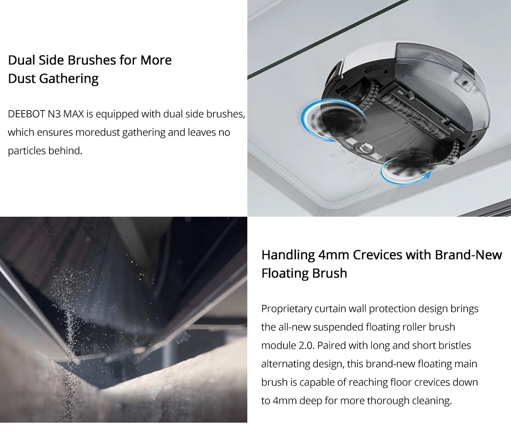 Multiple leading technologies applied in DEEBOT N3 MAX to ensure much higher dust removal rate in one time, intensive cleaning performance for your beloved home.
