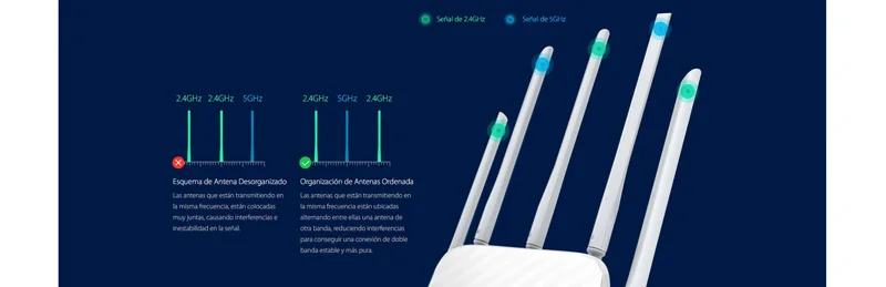 Tres antenas de 2.4GHz y dos antenas de 5GHz que crean una cobertura Wi-Fi superior