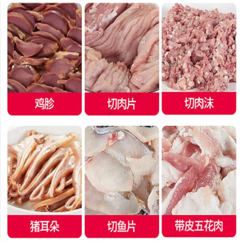 1. Большая емкость 2. Мощный двигатель 3 тонкая нержавеющая сталь 3. Тщательная работа 4. Хорошее качество, выгодная цена 5. Можно нарезать все виды свежего мяса 6. Использование нарезает все виды свежего мяса: свинину, говядину, курицу, рыбу и т. Д.