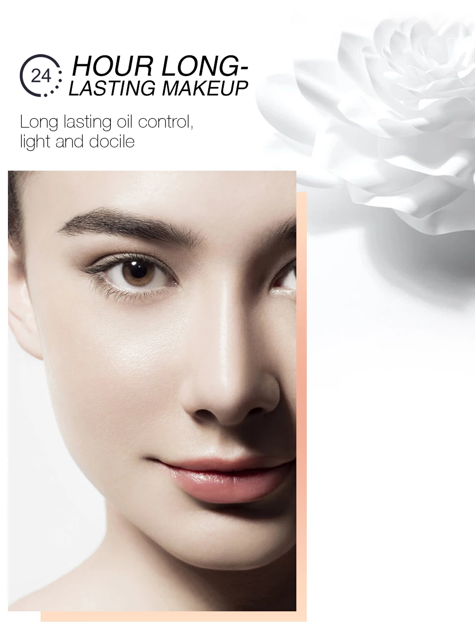 Сильная способность к настройке-пудра-легкая и тонкая, которая хорошо адсорбируется на коже, ее трудно отделить и свернуть. Он также может скрывать пороки пор, держать макияж идеальным в течение всего дня.