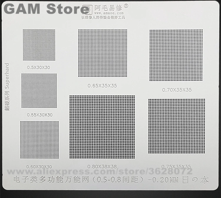 Описание:Универсальный BGA трафарет 0,5 0,55 0,6 0,65 0,7 0,8 места IC реболлинга шпильки припоя оловянный завод Amaoe квадратное отверстие отопление стальная сетка