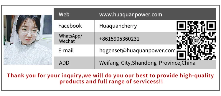 1. Генератор Huaquan 40 кВт, четырехцилиндровый сгорание, сильная мощность, большая емкость масла, чтобы обеспечить долгосрочную работу устройства.