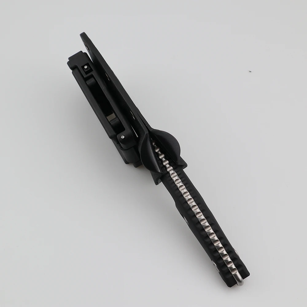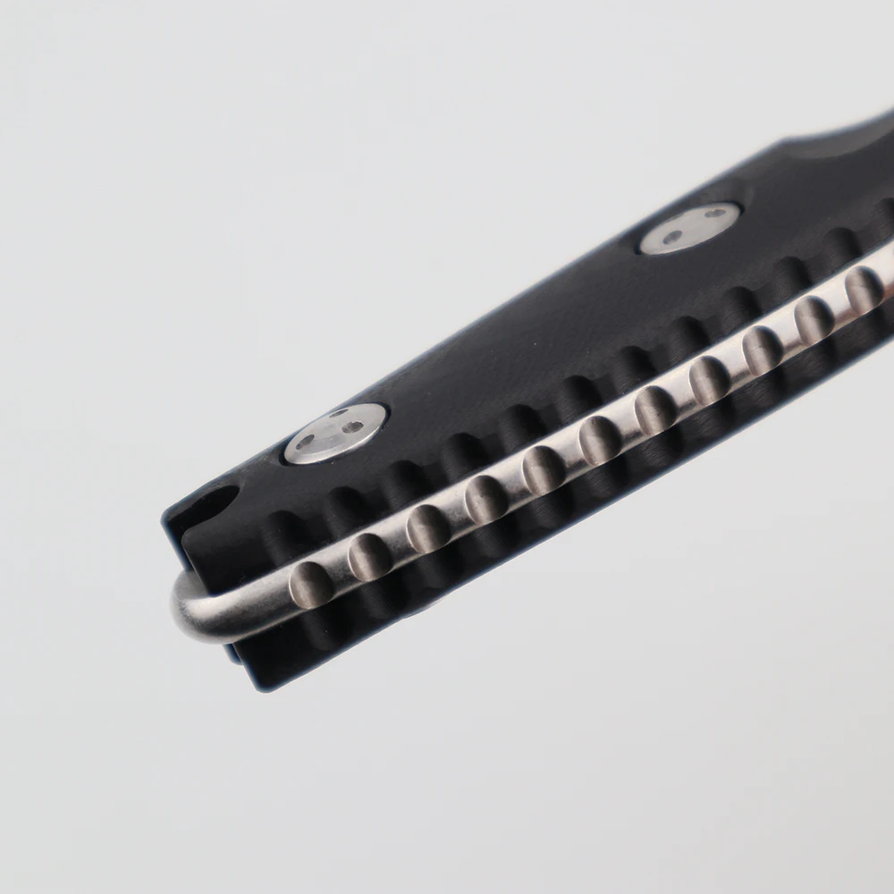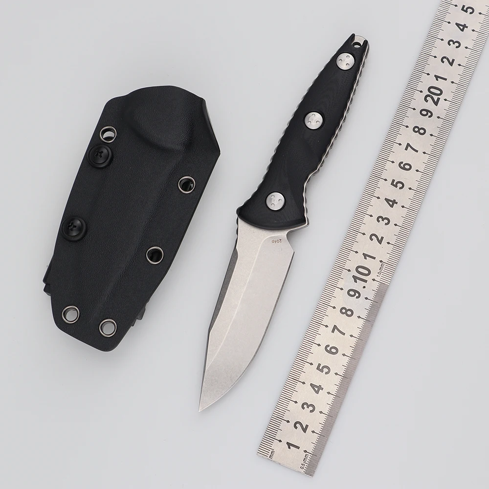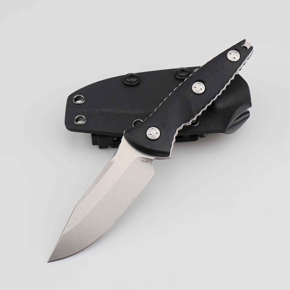 Длина: 206 мм Сталь лезвия: D2 криотерапевтическая обработка поверхности стального камня Твердость лезвия: 58-60HRC Толщина лезвия: 4,0 мм Длина лезвия: 89 мм Длина ручки: 112 мм Материал ручки и обработка: Черный G10, обработка ЧПУ Вес: 187 г (вес нетто), 286 г (включая рукав ножа). K оболочка ножа рукав, нож рукав push point дизайн, может вытащить нож быстро.