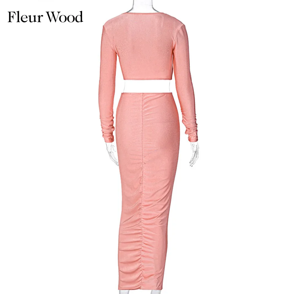Комплект из двух предметов FLEUR WOOD, женские короткие топы и длинная юбка, драпированная модная пикантная Женская одежда с глубоким v-образным вырезом и длинным рукавом длиной до щиколотки