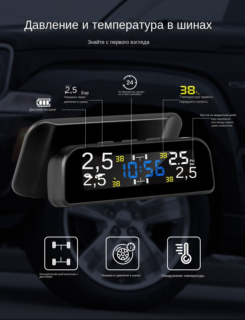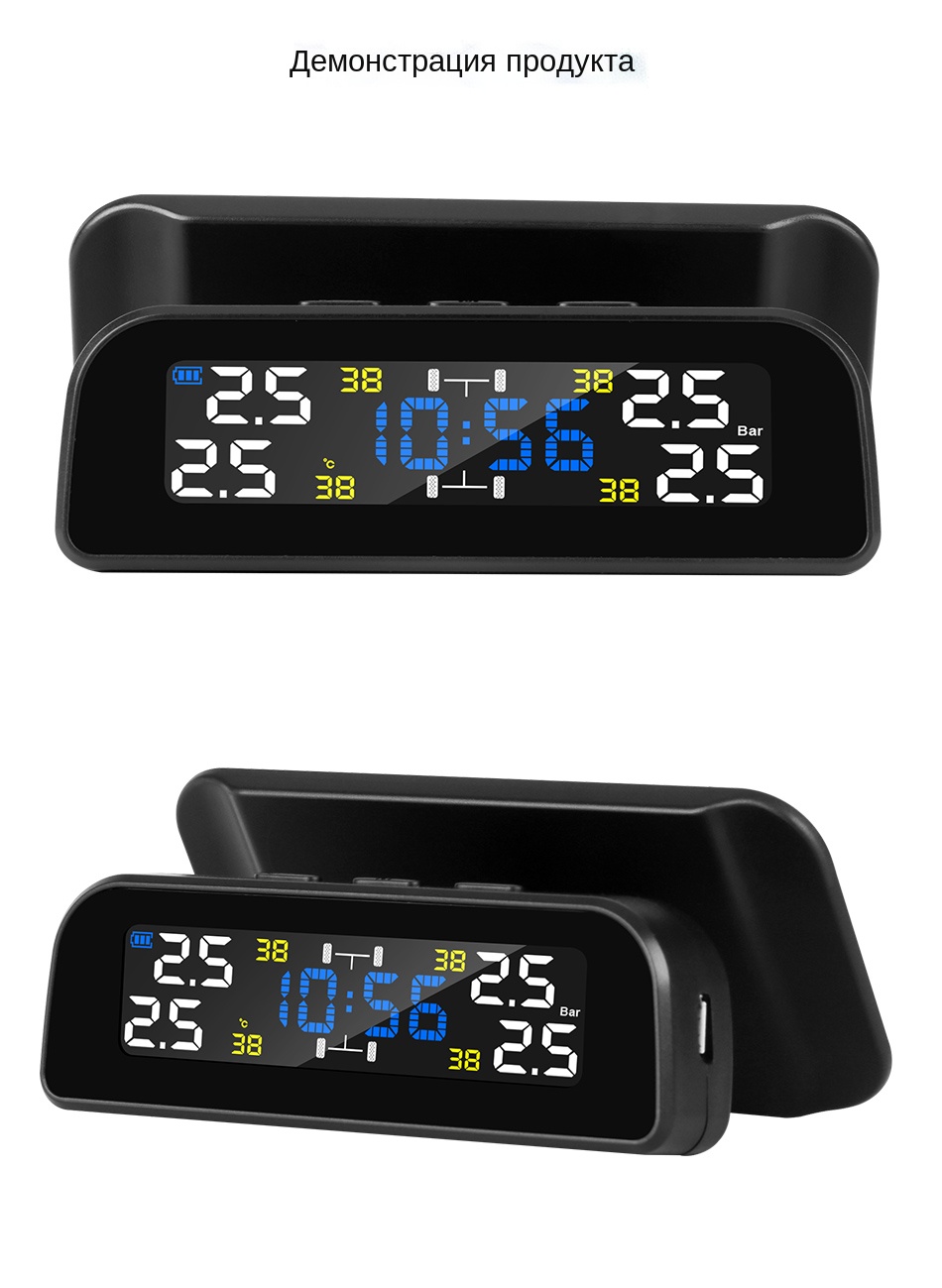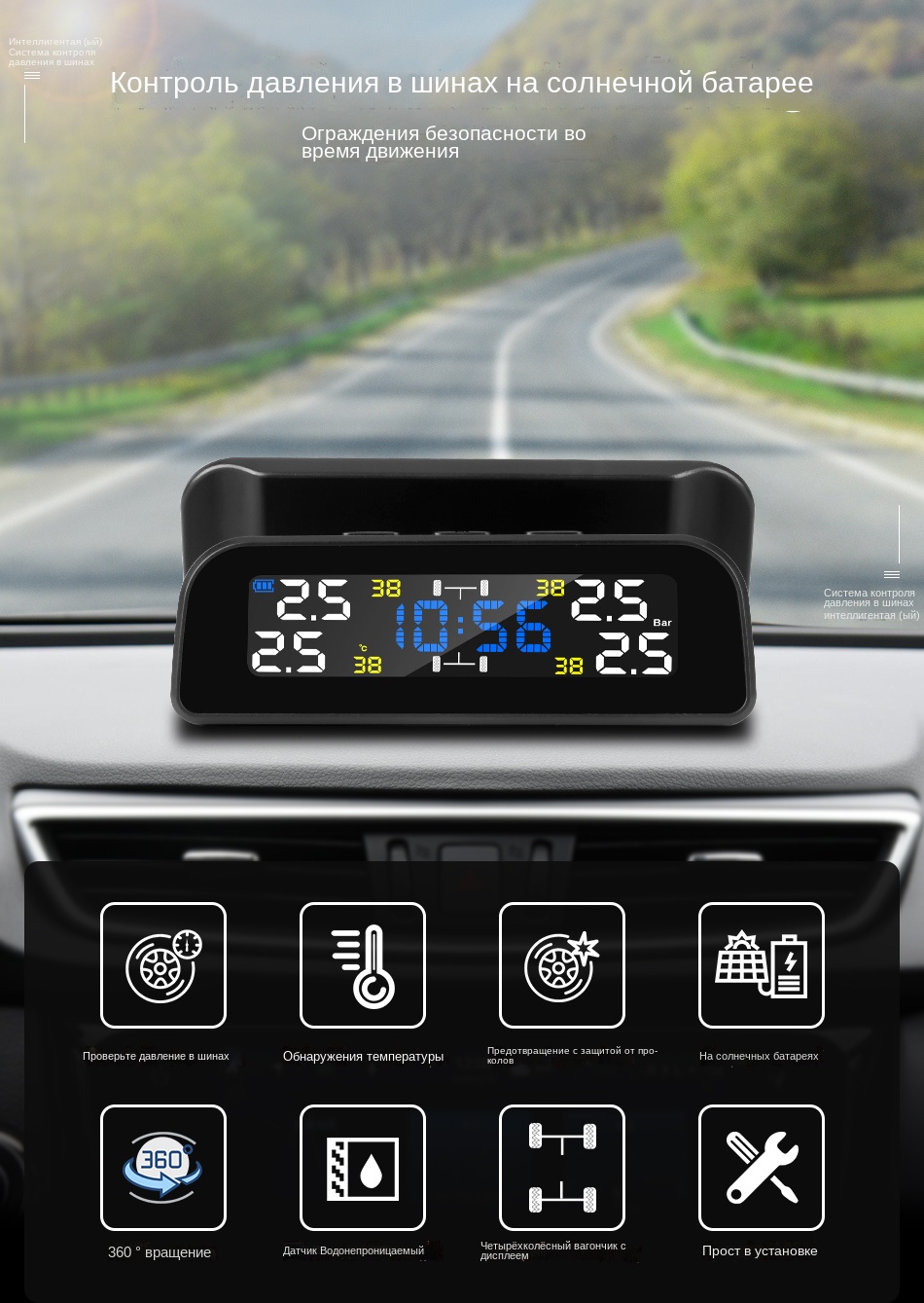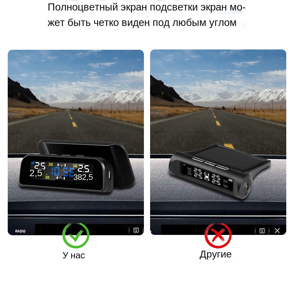 -Солнечная зарядка, не нужно подключать автомобильную прикуриватель для зарядки -Цветной ЖК-цифровой дисплей для четкого отображения информации о шинах -Мониторинг давления и температуры 4 шин в режиме реального времени -Низкое давление воздуха/высокая температура сигнализации -Сигнализация высокой температуры/утечки/низкого заряда батареи -Интеллектуальная ударная загрузка при движении автомобиля, не нужно включать/выключать -Беспроводное подключение с датчиками, простая установка,Крепится к стеклу -Внутренние датчики и внешние датчики, удовлетворяют все ваши потребности - Два блока (PSI / Bar) изменяется, вы можете установить тот, который вам нравится.Приемник может вращаться на 360 градусов
