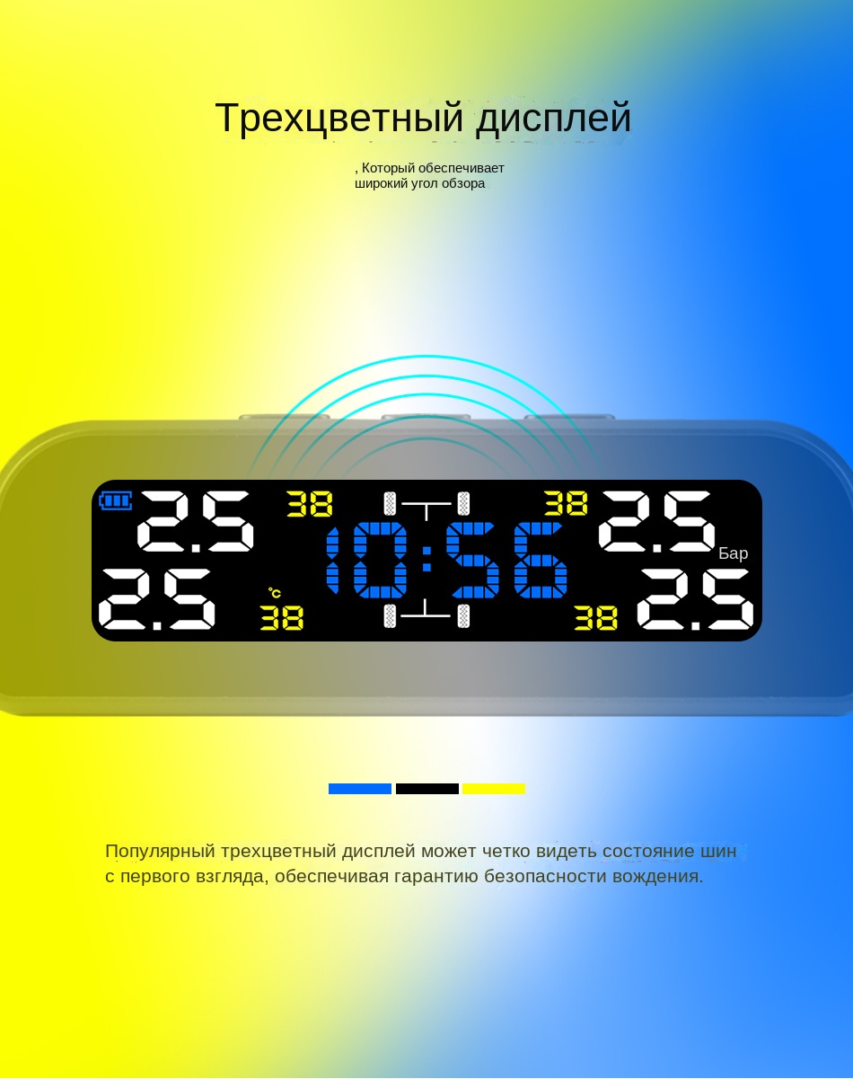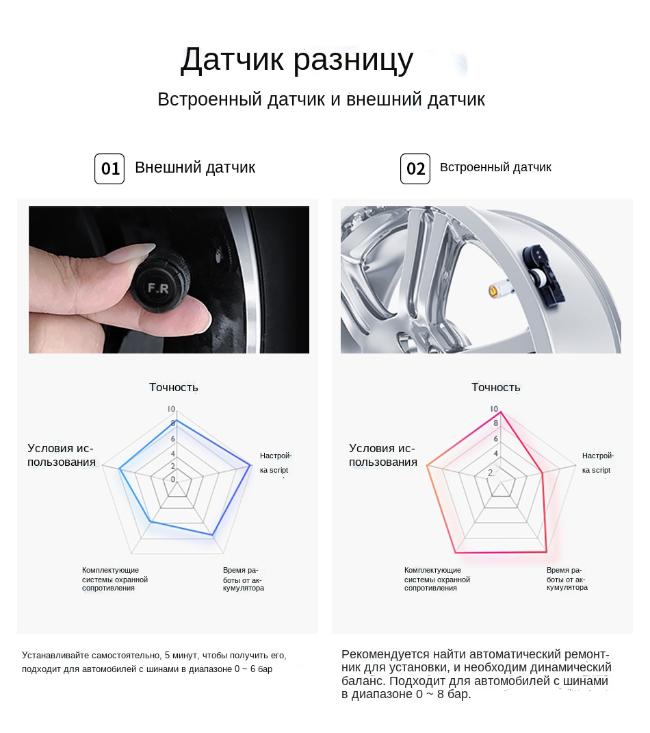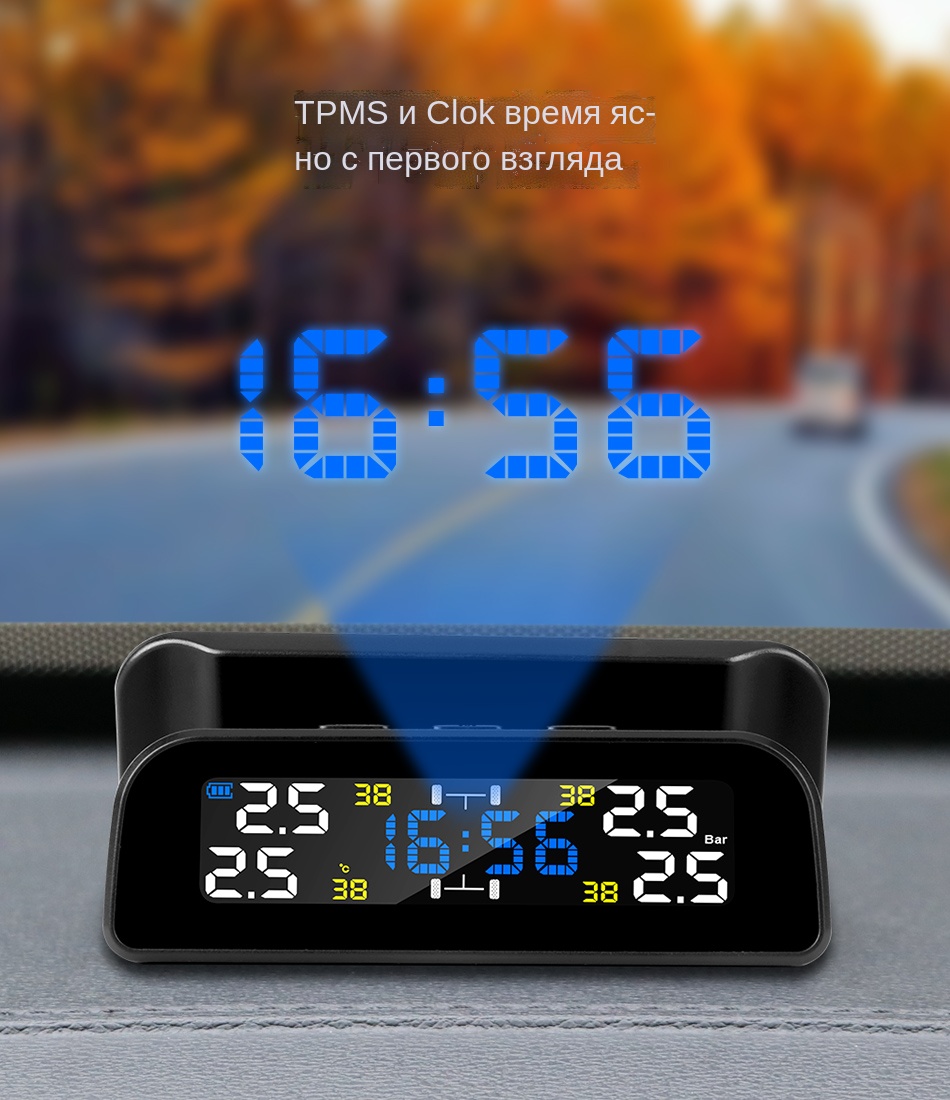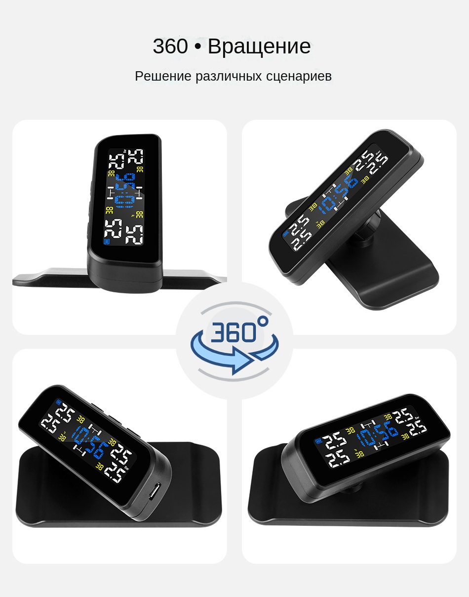-Солнечная зарядка, не нужно подключать автомобильную прикуриватель для зарядки -Цветной ЖК-цифровой дисплей для четкого отображения информации о шинах -Мониторинг давления и температуры 4 шин в режиме реального времени -Низкое давление воздуха/высокая температура сигнализации -Сигнализация высокой температуры/утечки/низкого заряда батареи -Интеллектуальная ударная загрузка при движении автомобиля, не нужно включать/выключать -Беспроводное подключение с датчиками, простая установка,Крепится к стеклу -Внутренние датчики и внешние датчики, удовлетворяют все ваши потребности - Два блока (PSI / Bar) изменяется, вы можете установить тот, который вам нравится.Приемник может вращаться на 360 градусов