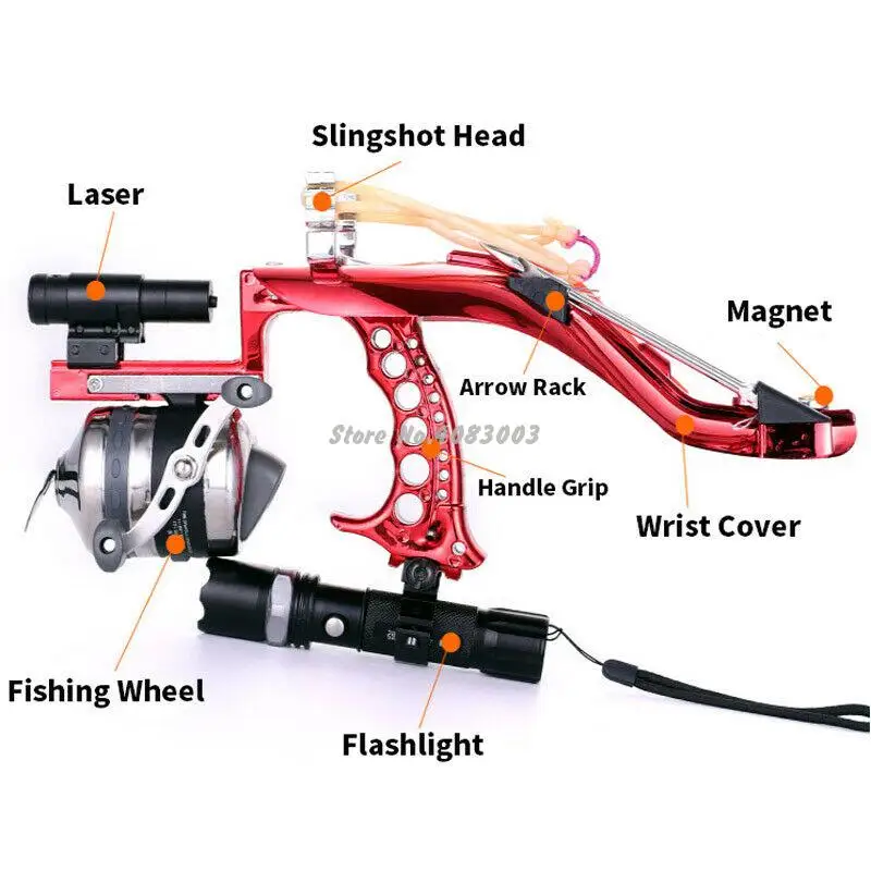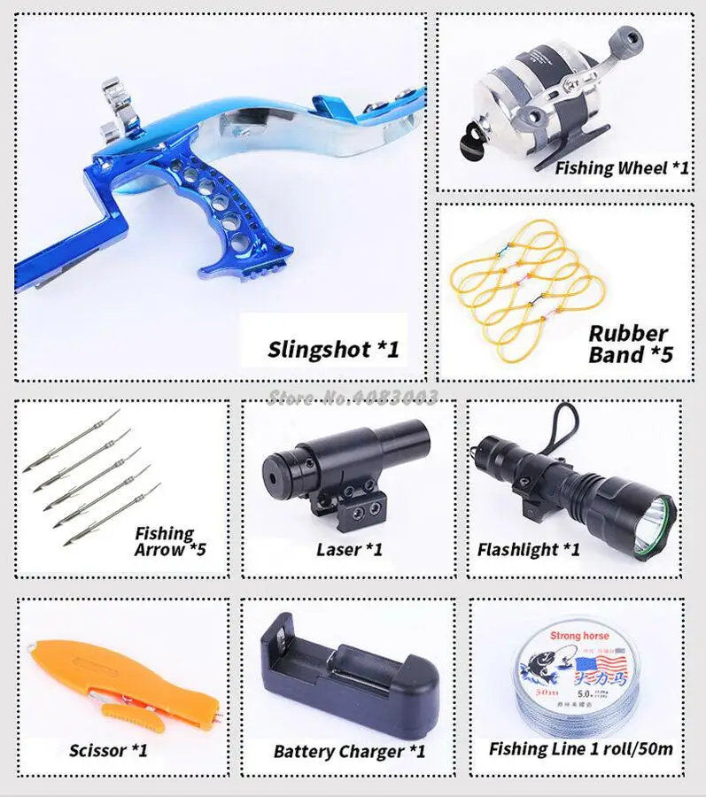 Высокая скорость эластичный Охота Рыбалка Рогатка стрельба катапульты лук стрелы советы слинг выстрел арбалет болт для стрельбы рыбыОдна Рогатка подходит всем, что вам нужноЛегко прикрепляется к лазеру, рыболовному колесу и фонарику, легко снимается стрела и стальной шар для защиты запястья. Рабочий день и ночь в любое время года.Передний лазер более прочно приземляется и обеспечивает точное руководство.Фонарик использует мощные светодиодный лампы и вырывает темную среду. Его фокус можно отрегулировать.Удобная ручкаЗащита запястья защищает вашу руку и руку от стрел, обеспечивая поддержку рогатки.Вы можете снимать стальной шар или рыболовную стрелу. У нас есть рыболовная стрела в этом изделии или любая стрела длиной около 20 см.Гибкое рыболовное колесоРыболовное колесо также было улучшено, что позволяет работать в левой или правой руке.Резак для рыбалки вырезает леску или легко удаляет водную траву.Высота банта: 205 ммДлина банта: 355 ммШирина рогатки: 75 ммВес нетто: 1027 г (включая лазерную указку, фонарик, рыболовное колесо)Цвет: красный, синийПосылка включает в себя:Набор А:1 Рогатка с чехлом на запястье1 металлическая Рыболовная катушка из нержавеющей стали5x резиновые ленты со стрелками5x рыболовная стрела1x лазер1 фонарик (требуется 1 аккумулятор 18650, аккумулятор не входит в комплект из-за ограничения доставки)1x зарядное устройство для аккумулятора 186501 рыболовная леска1x резак для лескиКомплект B:1 Рогатка с чехлом на запястье1 металлическая Рыболовная катушка из нержавеющей стали1 резиновая лента со стрелками2x рыболовная стрела1x лазер1 фонарик (требуется 1 аккумулятор 18650, аккумулятор не входит в комплект из-за ограничения доставки)Комплект C:1 Рогатка с чехлом на запястье1xПластиковая рыболовная катушка1 резиновая лента со стрелками1x лазер2x рыболовная стрелаПримечания:1. Пожалуйста, не ориентируйтесь на людей или других людей. Вызванные последствия не входят в нашу ответственность.2. Резиновая лента и пружина являются скоропортящимися изделиями, пожалуйста, измените их, если вы чувствуете, что они не мощные.