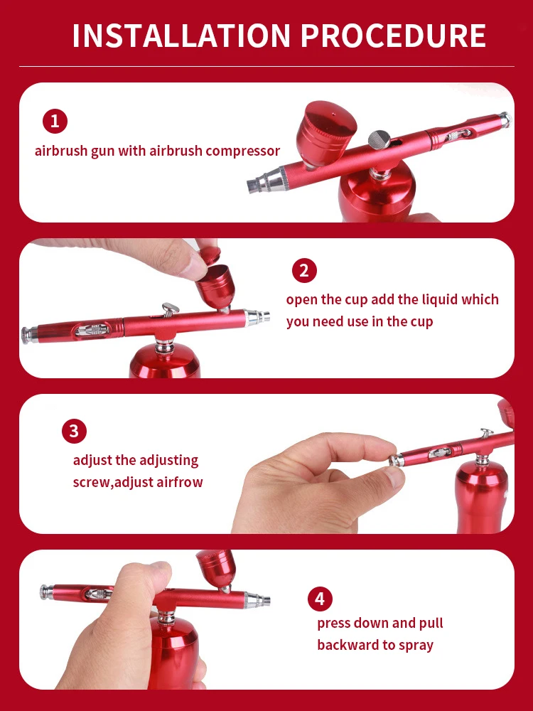 1. Сначала проверьте ручку водой. 2. Пожалуйста, не используйте толстые пигменты, которые повлияют на эффект выброса. 3. Вымойте внутреннюю часть распылителя в соответствии с этапами, указанными в руководстве после использования. 4. Установите спрей карандаш после очистки. Обратите внимание: Эта красивая специальная воздушная компрессора используется для макияжа, красоты, ногтей, временных татуировок, украшения тортов, низкой плотной степени красителя и т. д. и не должна использоваться для распыления толстой краски. Пожалуйста, получите Аэрограф после отладки в лучшем состоянии, а затем используйте тест на чистую воду, распыление является нормальным, вы можете использовать. Пожалуйста, используйте стабильность, при падении на землю, может повлиять на использование или повреждение. После использования, пожалуйста, очистите Аэрограф, избегайте засорения, эффект в следующий раз, когда вы обычно используете. Для того, чтобы защитить товар хорошо, профессиональный человек, чтобы изменить иглу и сопло будет рекомендовать