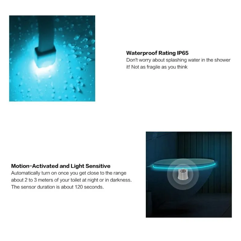 Есть 8 различных цветов дисплея на светильник, чтобы помочь вам быть более безопасным в ночное время и не бояться упасть или попасть в туалет.