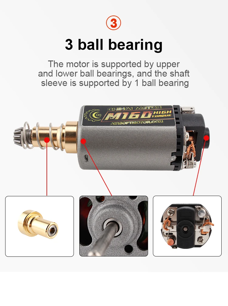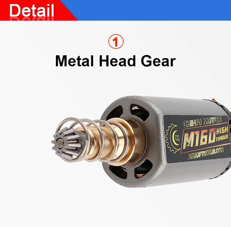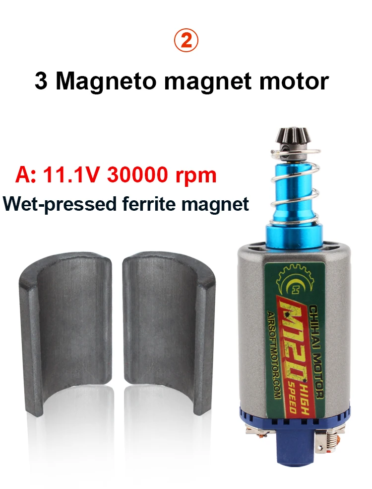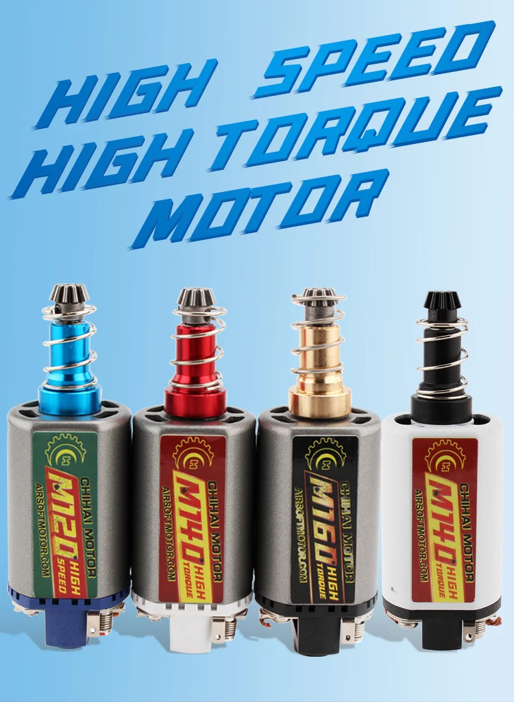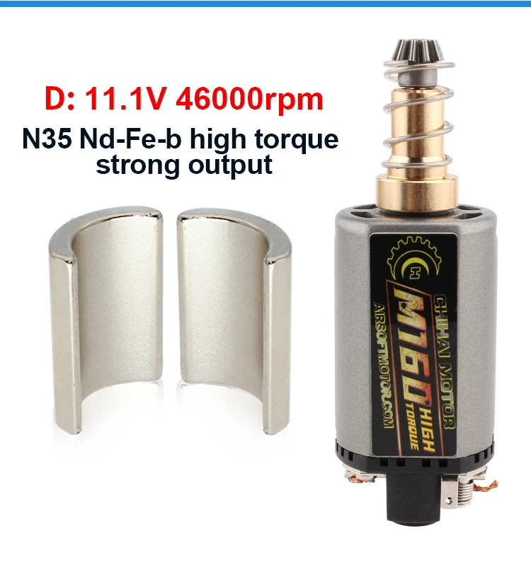 Product Type: CHIHAI MOTOR CHF-480SA/WA M120 M140 M160 long shaft ORDINARY AEG MOTOR LONG TYPE D HOLE Magnetic materials:wet-pressed ferrite magnet/N35 Nd-Fe-b DC11.1V : A: M120 30000RPM B: M140 34000RPM C:M140 30000RPM D:M160 46000RPM Weight:about 150g Characteristic: 1. Heat resistant, high performance magnets 2. Highly conductive motor brush 3. Reinforced Motor Axle Adaptation type: Long type for M4, M16, MP5, G3, M14 and P90 AEG. New Ultra Custom Series from ChiHai Motor High Torque Motor/Ultra Custom Motor is design for Ultra Power Upgraded Airsoft AEG. Suitable for G&P, M14, DMR, MK14 Crane Proto Conversion Kit Series.