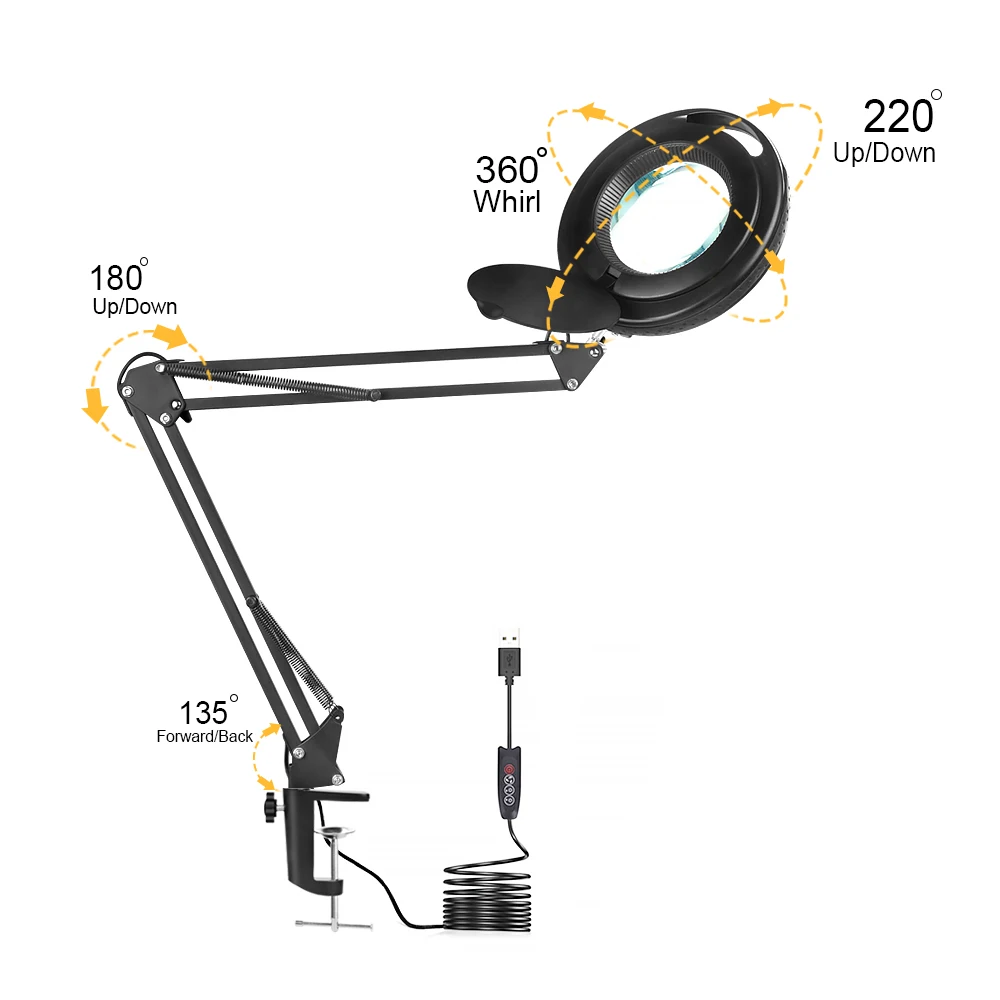 Увеличительное стекло несколько: 5X светодиодный увеличительное стеклоСветодиодный: 72 SMD светодиодный светильникСветодиодный светильник цвет: белый/теплый/желтыйЗатемнение: 3 цветовых режимаАдпатер постоянного тока: 5 В 2 АСветодиодный светильник с 10 уровнями яркостиРежим управления светильник: Кнопка питания USBАбажур: пылезащитный чехол с лупой Характеристика:1. Гибкий режим переключения питания: управление через USB. Штепсельная вилка может быть заменена по желанию, что удобно и быстро.2. Настольное фиксированное основание, регулируемые винты, с противоскользящей конструкцией, безопаснее и стабильнее в использовании, для удовлетворения требований к применению всех толщины рабочего стола не более 6 см.3. Три цвета теплого/желтого/белого регулируются, 10 уровней яркости можно регулировать, что может удовлетворить различные потребности и варианты4. Длина ручки составляет 220 мм + 220 мм и 330 мм + 330 мм на выбор, что может удовлетворить потребности многоугольного освещения5. Специально разработан Пыленепроницаемый Чехол для увеличительного стекла, чтобы объектив был чистым и более эффективным в эксплуатации6. Подходит для чтения рабочих/компьютерных досок/ювелирных изделий/ремесел любителей/сварочных работ/ухода за кожей красоты, он может быть использован универсально.Посылка включает: