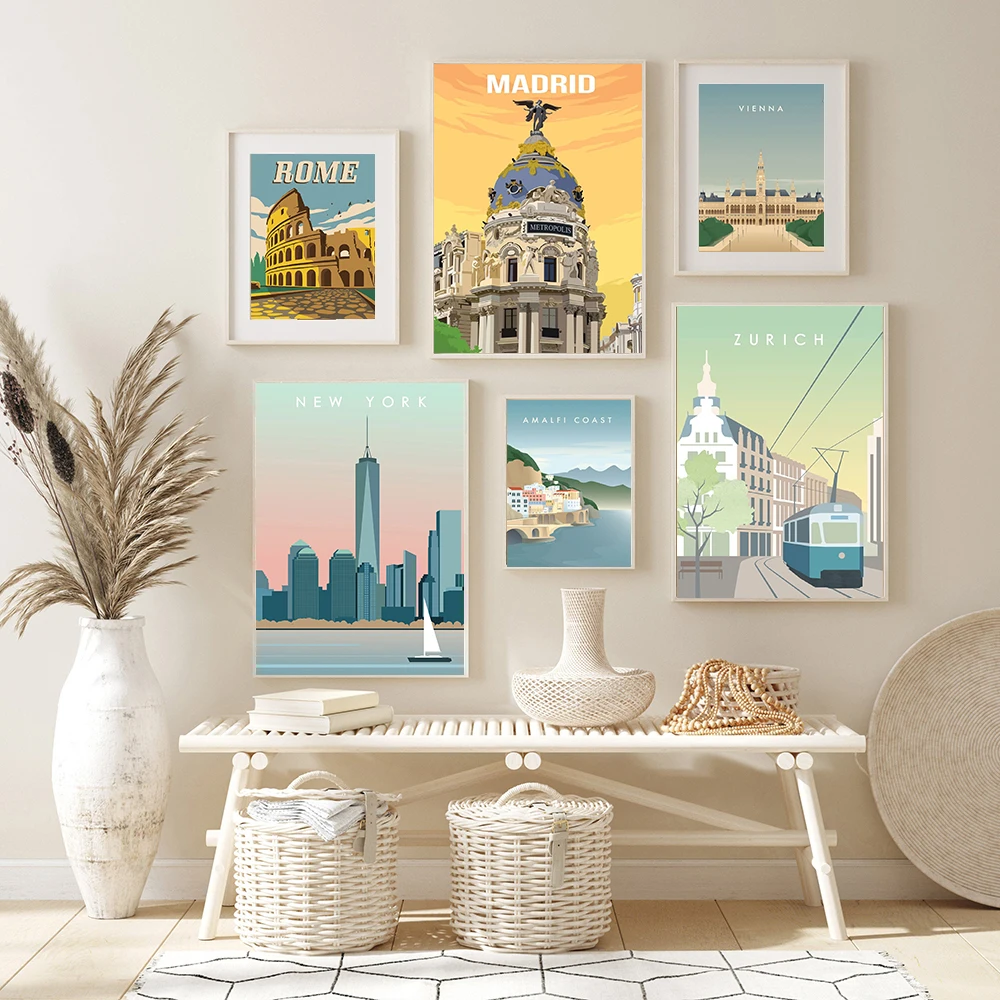 Скандинавский винтажный туристический городок Нью-Йорк постер Римский Венский Zurich Швейцария пейзаж Искусство Холст Картина Настенная картина домашний декор