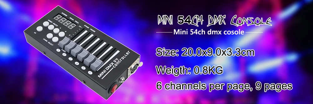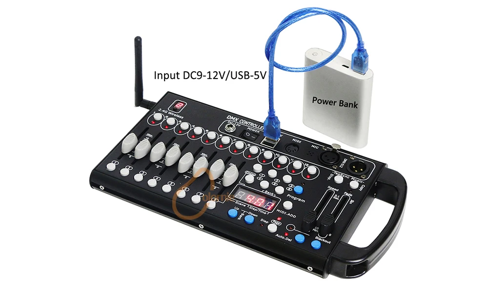 Вход DC9-12V или Power Bank 5V. Встроенный беспроводной передатчик, 12 сканеров управляют до 16 каналов на каждом приборе. Сцены могут быть запрограммированы на 6 последовательностей погони, каждая из которых удерживает до 240 сценок, которые могут быть запущены звуком, вручную нажатием или автоматически временными фейдерами в диапазоне от 0,1 секунд до 10 минут. Этот контроллер идеально подходит для небольших театров или сценических приложений.