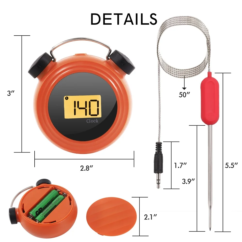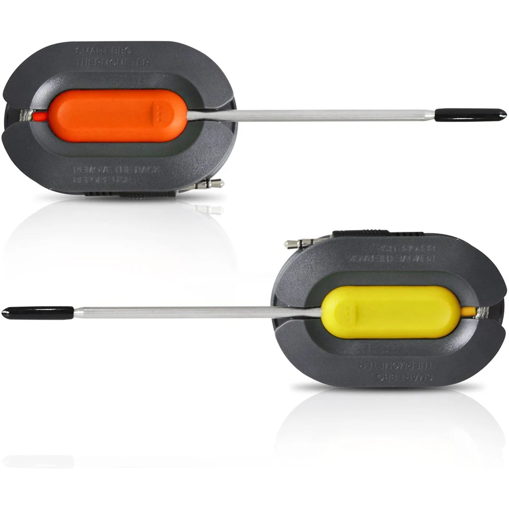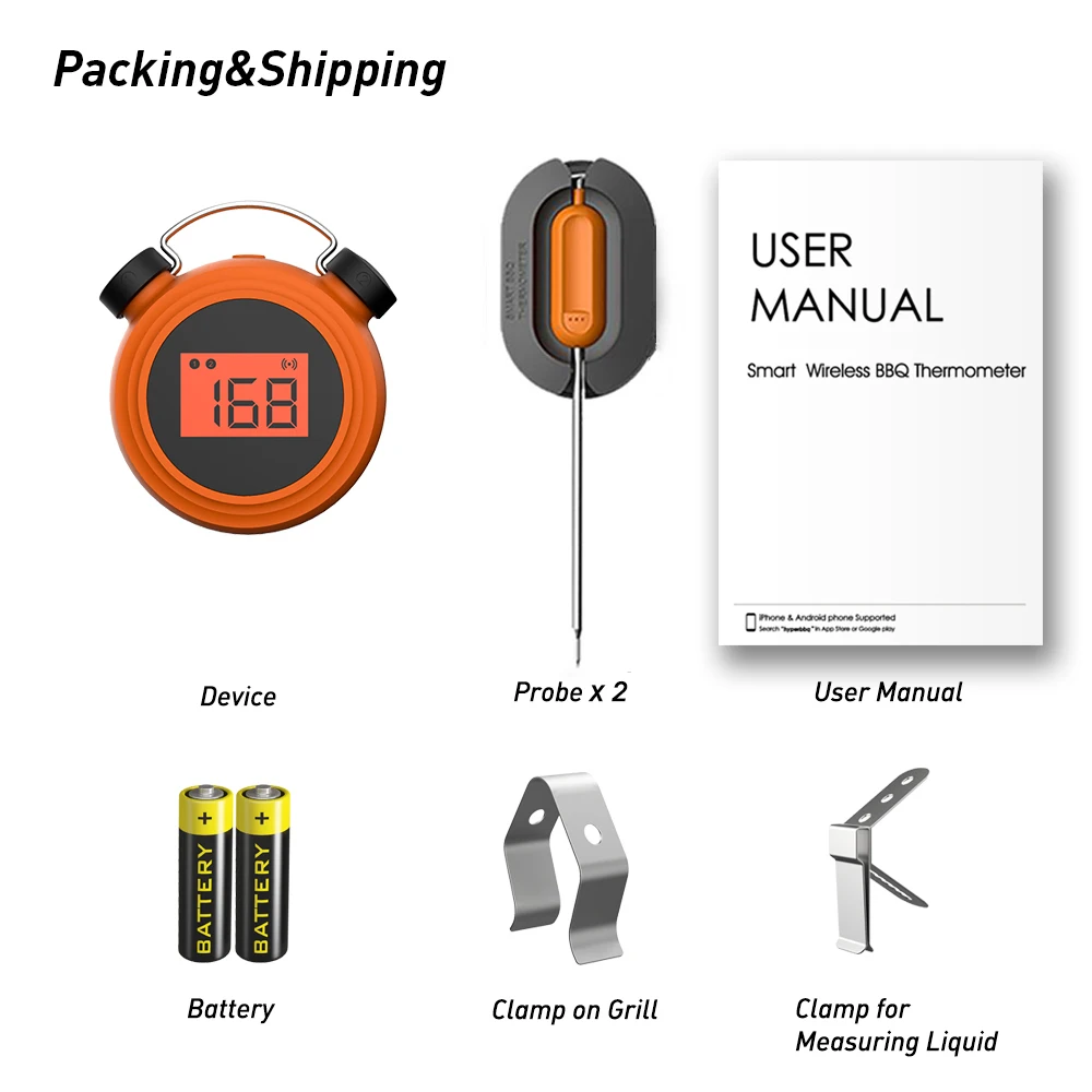 ● Мини-термометр для барбекю оснащен технологией Bluetooth и поставляется с 2 цветными зондами из нержавеющей стали, которые могут использоваться для одновременного чтения двух типов продуктов питания, что делает это устройство чрезвычайно удобным.