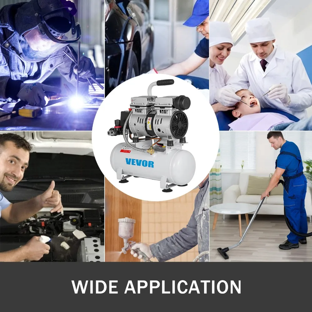 Этот 2 галлона/9л безмасляный воздушный компрессор оснащен ультра тихим мотором и насосом без масла для бесплатного обслуживания. Разработанный с компактным размером и двигателем из чистой меди, он прост в транспортировке и может похвастаться быстрым потоком воздуха и высокой производительностью. Хороший выбор для ремонта дома, надувания шин, чистки пола, окраски листового металла, стального воздушного пистолета, медицинской стоматологии и т. Д.