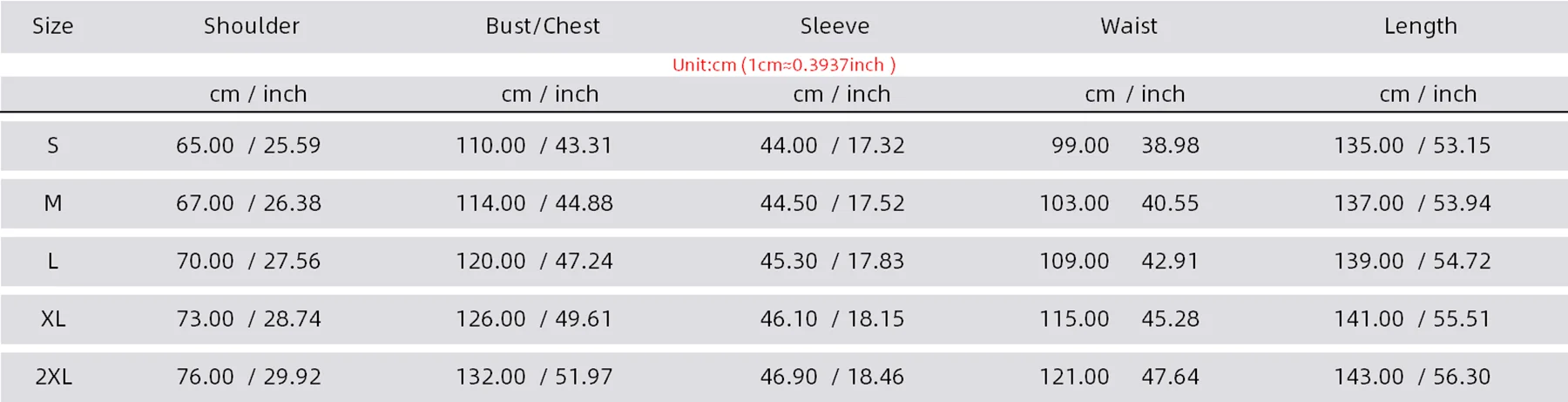 Единица измерения: см * Размер S, плечо 65 см, грудь 110 см, рукава 44 см, талия 99 см, длина 135 см * Размер M, плечо 67 см, Грудь 114 см, рукава 44,5 см, талия 103, длина 137 см * Размер L, ширина плеч 70 см, обхват груди 120 см, длина рукава 45,3 см, обхват талии 109 см, длина 139 см * Размер XL, плечо 73 см, Грудь 126 см, рукава 46,1 см, талия 115 см, длина 141 см * Размер 2XL, Плечо 76 см, грудь 132 см, рукава 46,9 см, талия 121 см, длина 143 см
