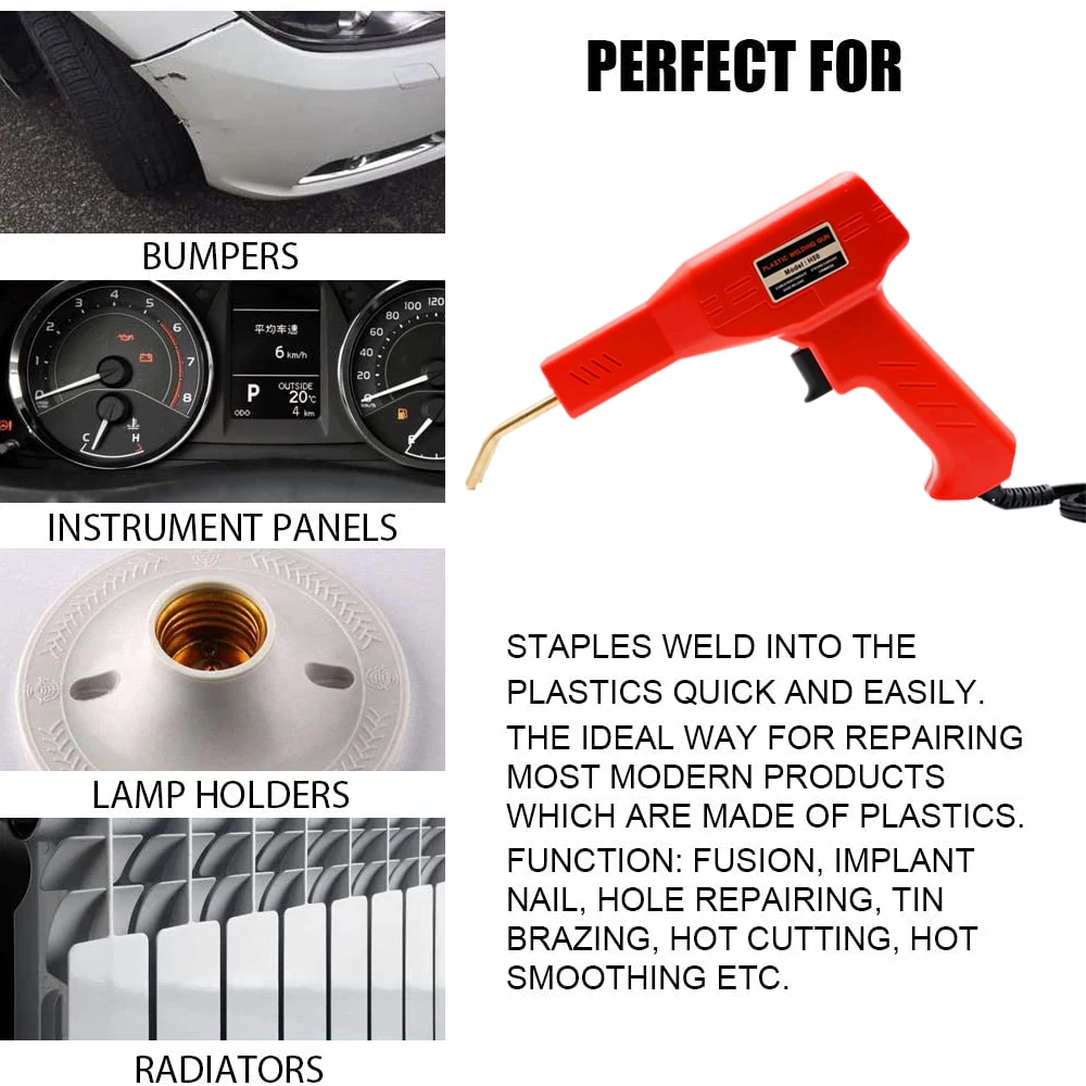 Особенности:* Идеальный способ отремонтировать большинство современных изделий из пластика. * Устойчив к ударам и скручиванию после ремонта. * Нержавеющая стальные скобы не ржавеет. * Волнистый степлер для максимальной нагрузки. * Быстрая и простая эксплуатация. * Обучение не требуется. Научитесь использовать за секунды. * Эргономичный дизайн помещается в ладони. * Скобы быстро и легко свариваются в пластик. * Ремонт не менее 98% пластмасс на рынке. * Идеально подходит для ремонта: треснувших бамперов, фар, пластиковых крыльев и многого другого.