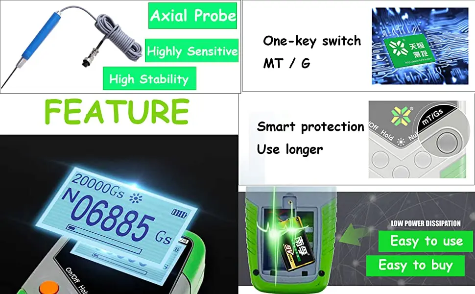 1. Предназначен для измерения плотности поверхностного потока материалов постоянного магнита B, диапазон: от 0 до 2400 mT.