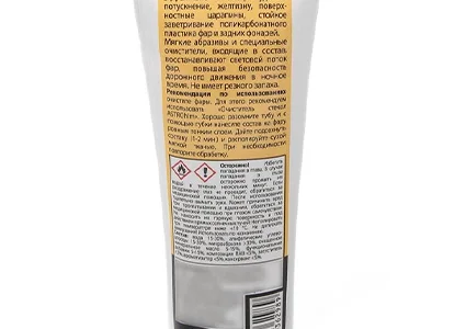 Returns the transparent plastic lost shine and restores the original transparency (headlights, turn signals, stop lights). Soft abrasives and special cleaners included in the composition restore the luminous flux of the headlights, increasing road safety at night.