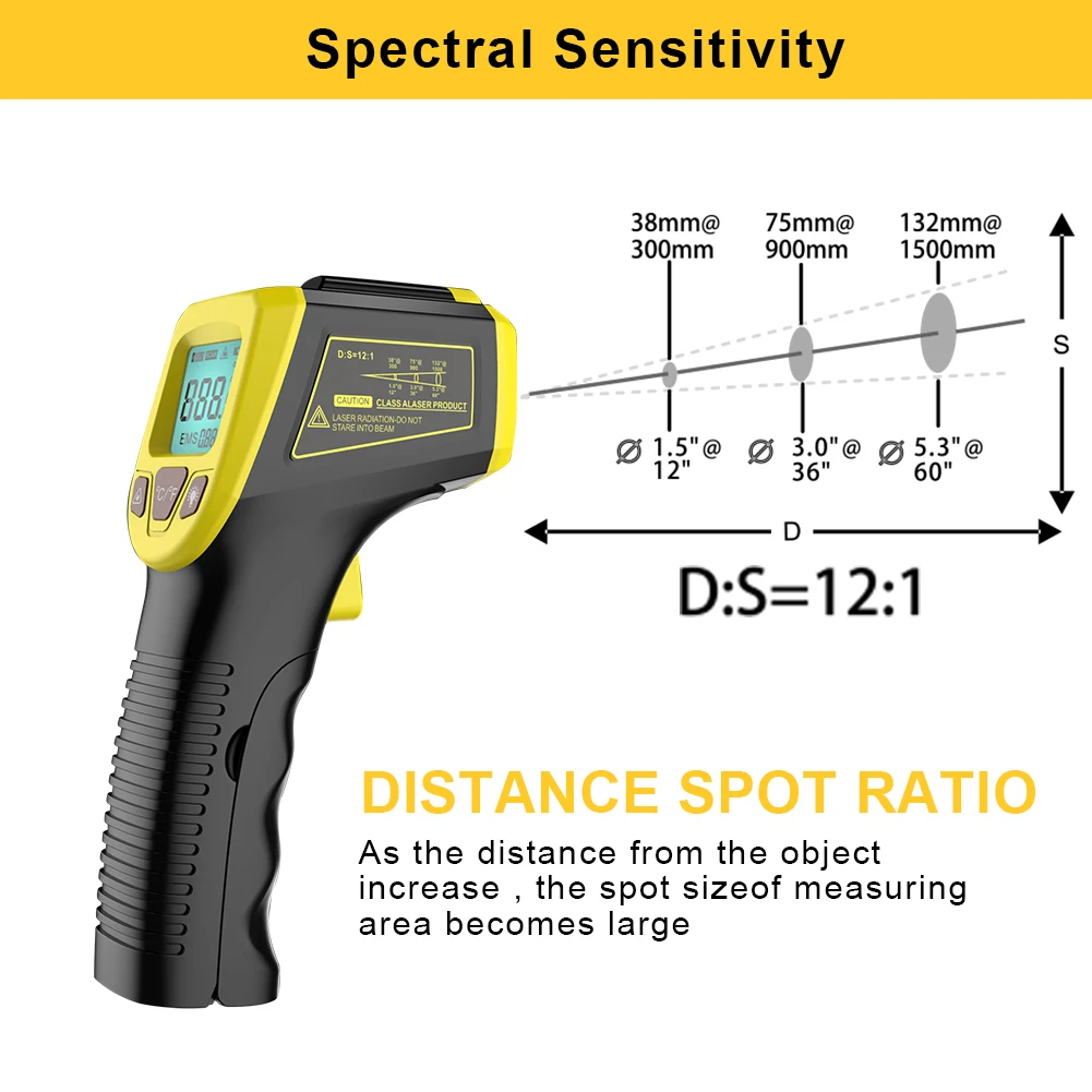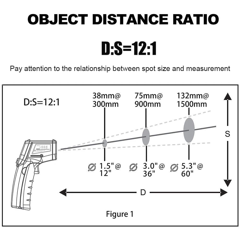 1. Соотношение расстояния до точки составляет 12: 1, что означает, что лазерная ручка может точно измерять цели на больших расстояниях по сравнению с большинством других термометров; Для лучшей точности, расстояние между термометром и предметом измерения должно быть приблизительно 14. 17 дюймов (36 см)