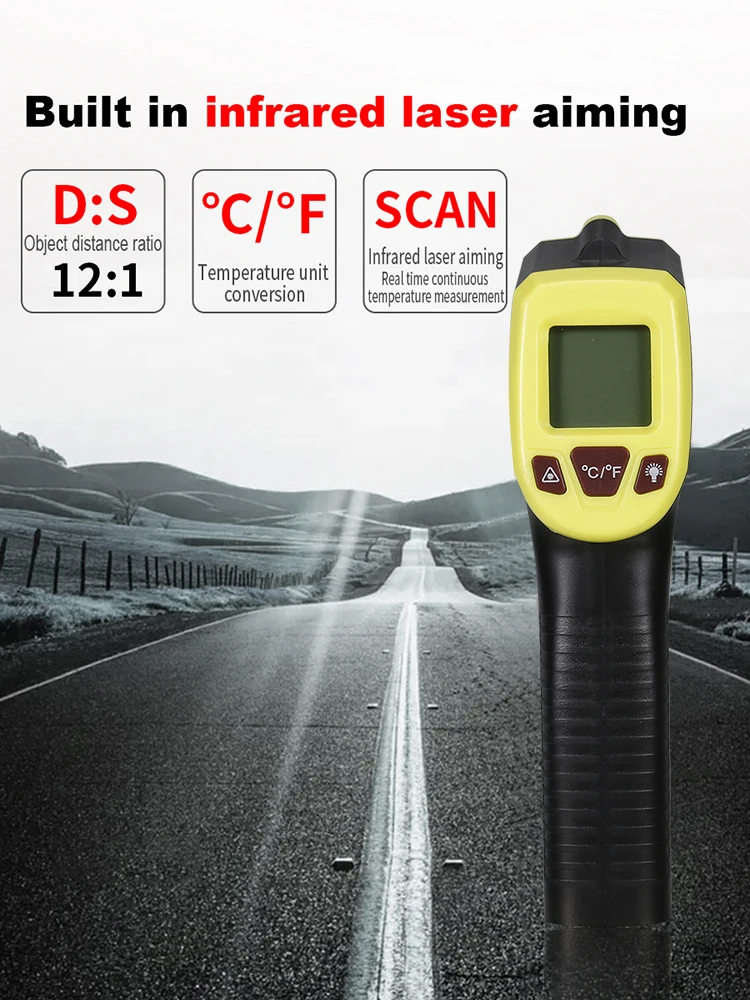 2. Измерьте температуру поверхности в диапазоне от-58 ℉ до 1112 ℃, -50 ~ 600 ℃, вы можете выбрать единицу от ℉/ ℃; Время отклика: ≤ 500 мс; встроенный лазер дает вам точность, чтобы отточить точное пространство, которое вы хотите измерить
