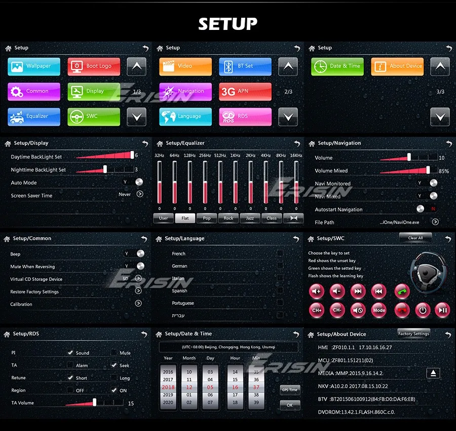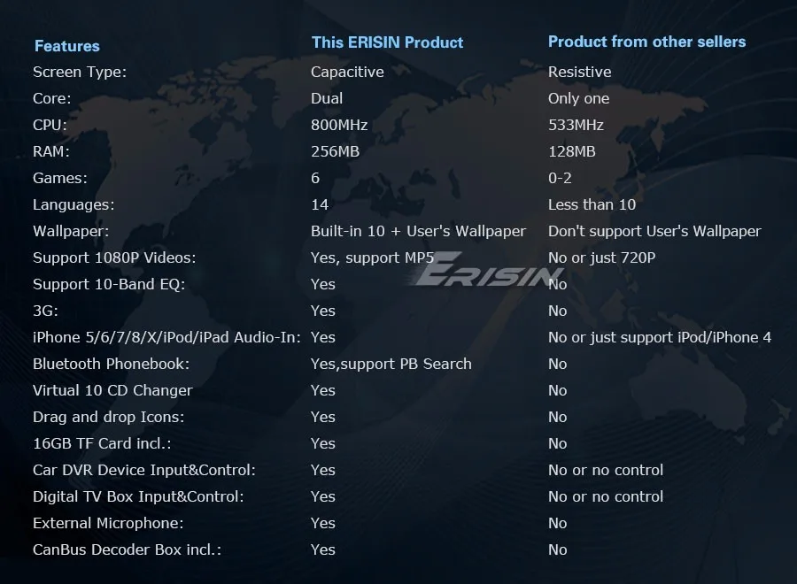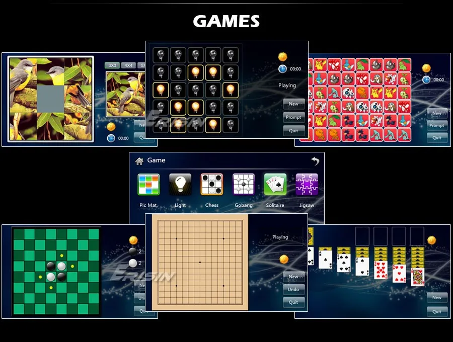 ES580, ES880, ES581, ES585. ..), AUX AV-IN, MIC-In (внешний вход микрофона), управление рулевым колесом, Встроенный 6 игр, калькулятор, 102 логотипа загрузки, 10 предварительно загруженных обоев и может обновлять обои пользователя, показывать плейлисты iPod/iPhon/iPad и играть.