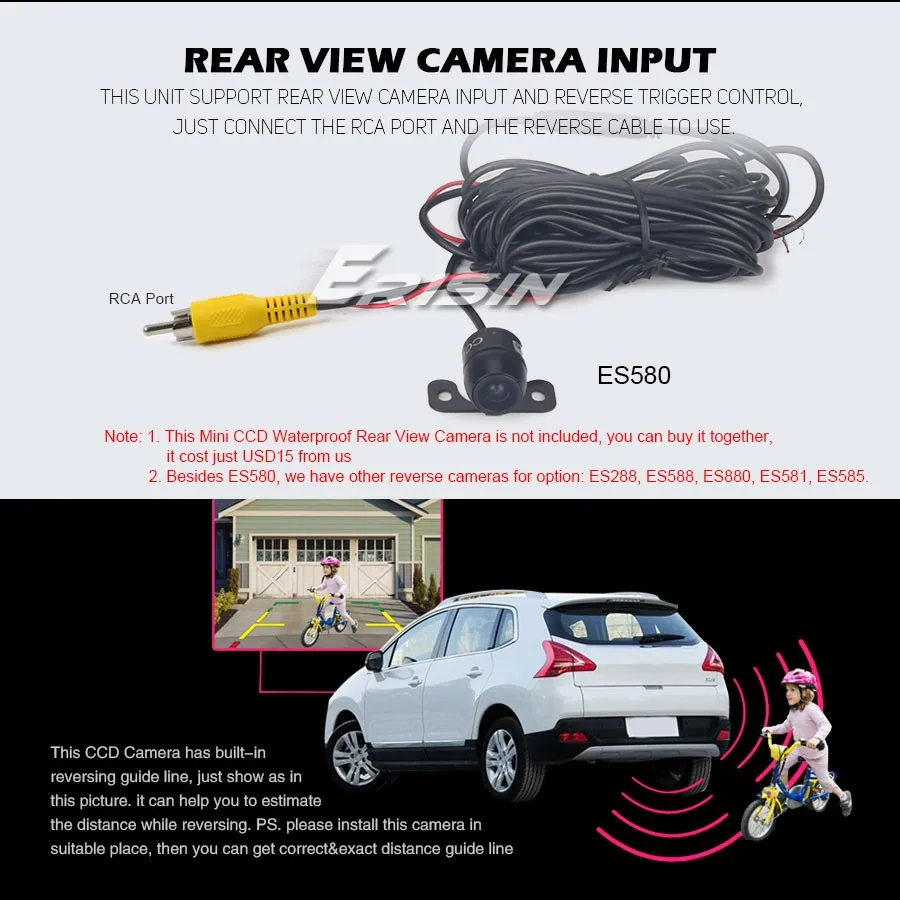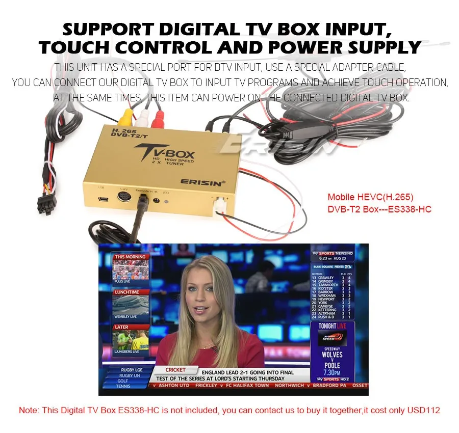 Он имеет 2 специальных порта дляЦифровой ТВ-бокс и DVR-камера, Вы можете связаться с нами, чтобы купить наш DVB-T2-бокс (ES338-HC) и видеорегистратор-камеру (ES452) для использования, этот блок может поддерживать подключенную DVR-камеру или DVB-T2 av-вход + Сенсорное управление + источник питания.
