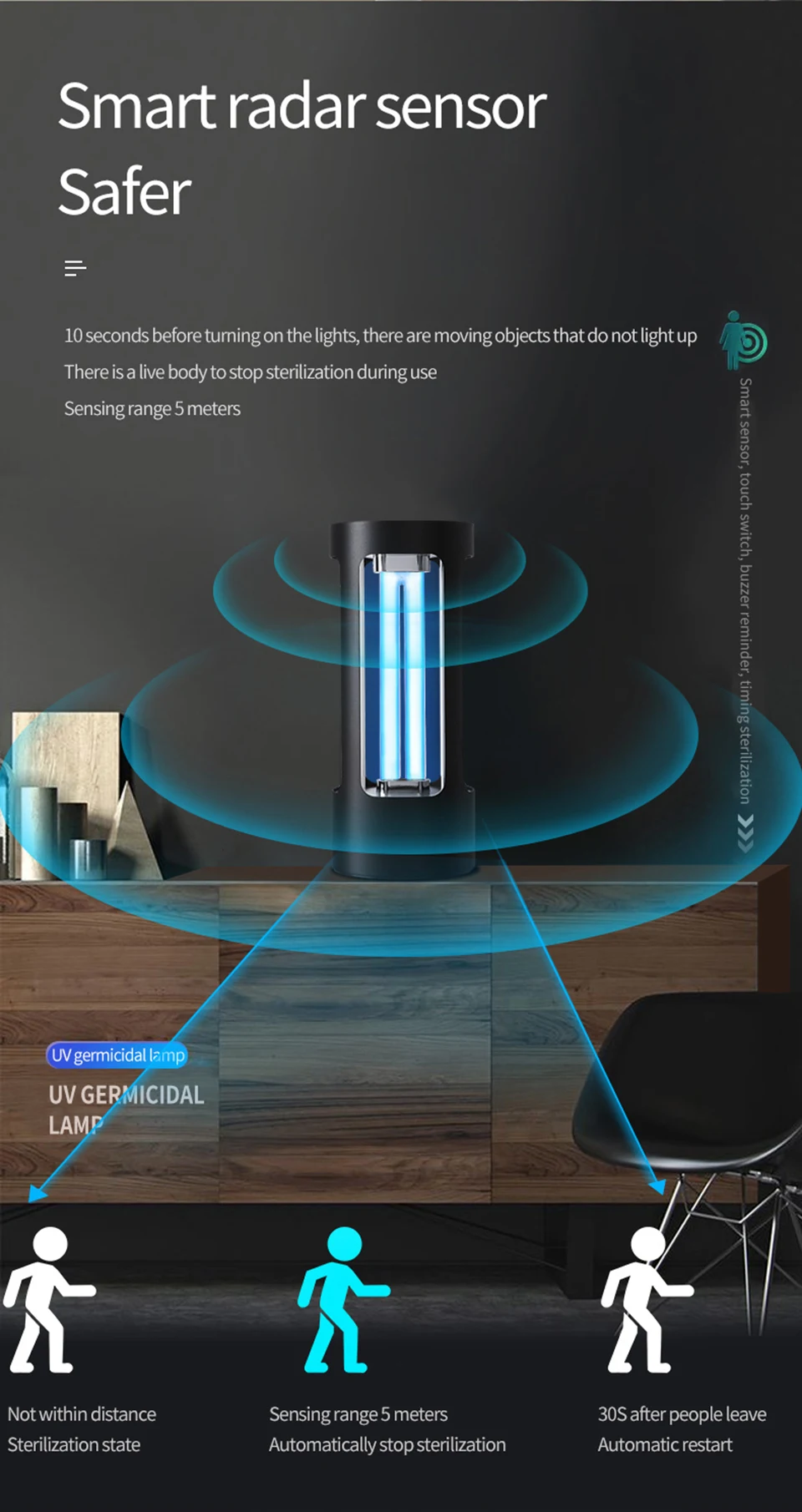 1. Функция радиолокационного обнаружения/обнаружения человека: он может распознавать людей и животных в пределах 5-8 метров. Когда люди и животные приближаются, УФ-лампы перестают работать. После того, как люди и животные уходят, лампы UVC могут работать нормально.