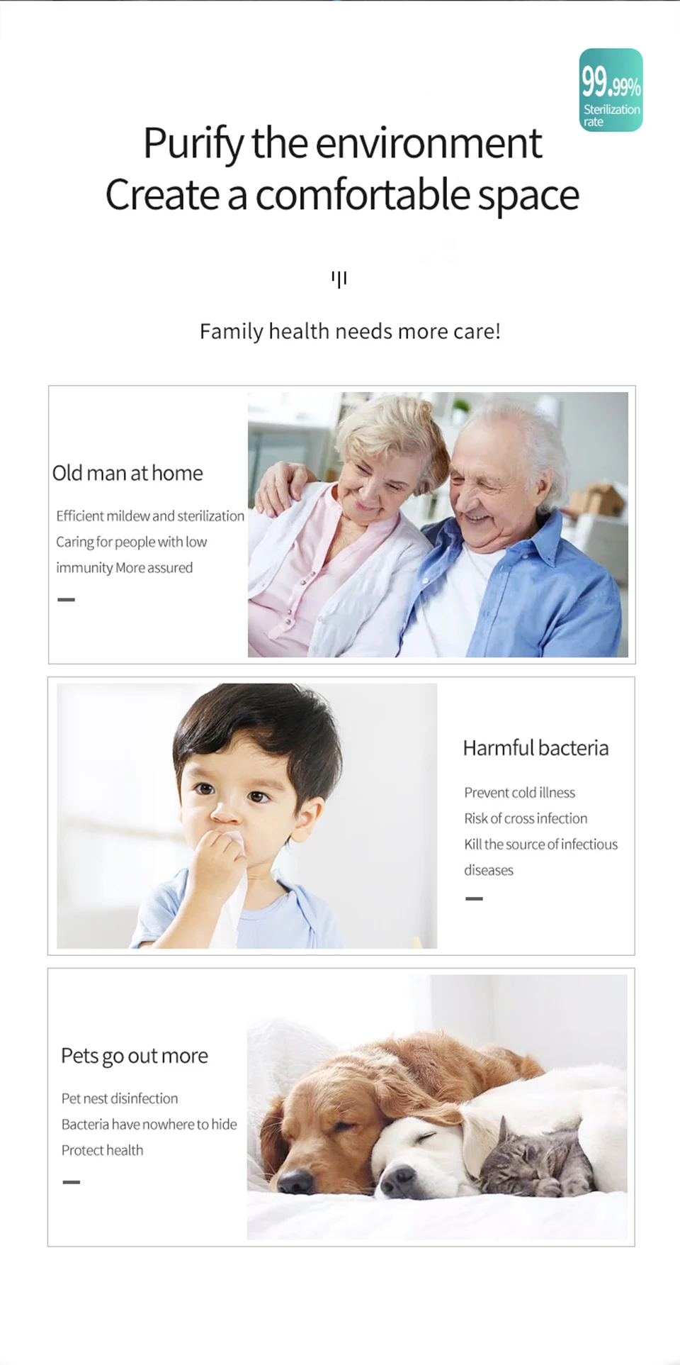 1. Убивают пылевых клещей: пылевые клещи-это крошечные существа, которые невидимы невооруженным глазом, на кровати, подушке, диване, ковре, они повсюду в доме и делают много вреда: пылевые клещи укусывают кожу людей вызывают зуд и покраснение кожи, позволяют людям не спать и дискомфортно. Лучи этой лампы UV-C на сотни раз сильнее солнечного света, они могут убить пылевых клещей немедленно.
