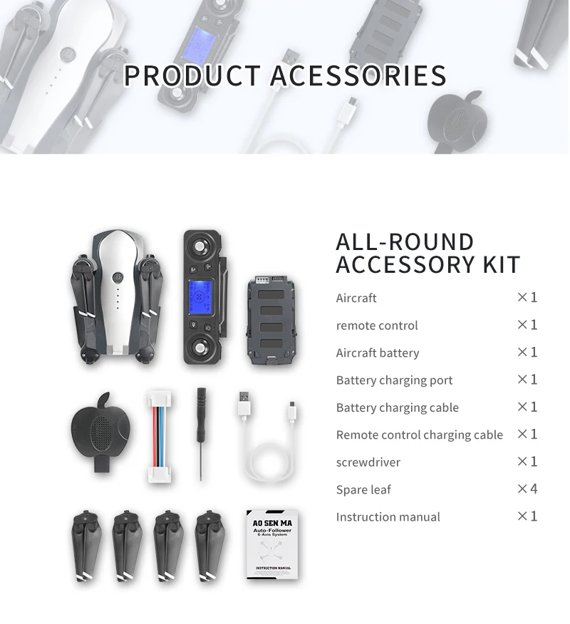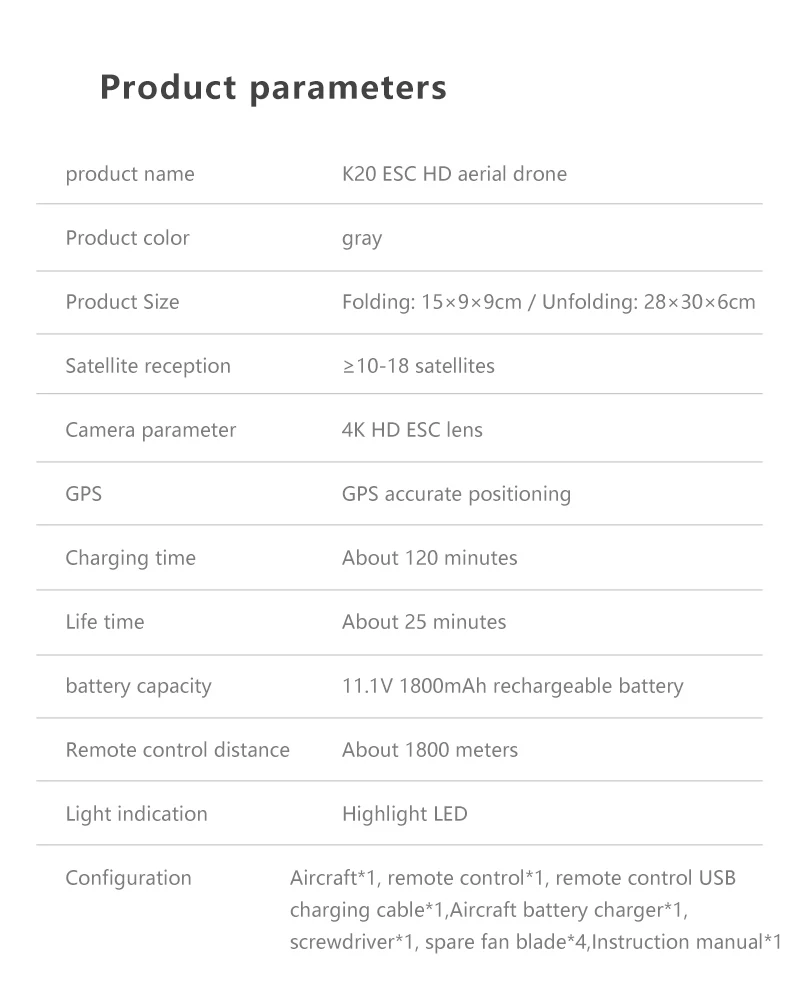 Особенности: -С складной ручкой, маленький размер, легко носить с собой. - Широкоугольная Карданная камера 4K HD. Широкоугольная камера 110 ° для увеличения пространственной глубины фотографического изображения, gimbal делает фотографию более стабильной. -С5G WIFI Функция может быть подключена к приложению, делать фотографии/видео, передача в реальном времени через Изображение камеры телефона - GPS вспомогательный полет. Предоставляет вам точные детали позиционирования вашего дрона. Дрон автоматически вернется домой точно, когда его батарея Низкая или сигнал слабый, когда вылет из диапазона, никогда не беспокоясь о потере дрона. -Режим удержания высоты. Установив давление воздуха снаружи, Квадрокоптер может стабильно парить в воздухе, что облегчает съемку. -Фото жестов/видео. Вы сломаете старый способ фотографирования и найдете новую вещь, сделав жесты, чтобы записать вашу красоту. (в пределах 1-3 м) - Максимальное время полета 25 минут. Повышенной емкости 11,1 V 1800 мА/ч, интеллигентая (ый) батарея производит до 25 минут времени полета. - Бесщеточный двигатель. Он такой тихий, но очень мощный во время бега. Поломка редко происходит, и замена двигателя редко требуется, что делает ваш полет более приятным. - Режим следования за мной. Дрон будет автоматически следовать за вами и захватывает вас везде, где вы двигаетесь. Держать вас в кадре в любое время, легче получить сложные снимки, обеспечивает беспилотный полет и самообслуживания - Режим полёта Waypoint. Откройте приложение drone, используйте план полета у вас под рукой, просто нарисуйте маршрут на экране, вертолет будет автоматически летать по указанному пути. -Окружность фиксированной точки. Выберите одну точку, затем Дрон будет летать вокруг точки по кругу. 6-axis g-yro, который может иметь более стабильный полет и быть простым в управлении. -Фюзеляж квадрокоптера изготовлен из высокопрочного и стойкого инженерного пластика, легкого и прочного сопротивления. Функция: 5G Wi-Fi FPV, камера Gimbal, широкоугольная камера, приложение управления полетом, GPS автоматическое возвращение, расстояние полета 1000 метров, режим следования за мной, режим высоты, режим полёта Waypoint, объемный режим фиксированной точки, жестовая фотография/видео, режим виртуальной реальности, Безголовый режим, фиксированное переключение, один ключ выкл/посадка, возврат одной кнопки Посылка: 1 пульт дистанционного управления1 * Аккумулятор дрона4 запасных листа1 отверткаКабель зарядного устройства-1 шт.1 x порт зарядного устройства1 х Руководство по WIFI1 х руководство на английском языке