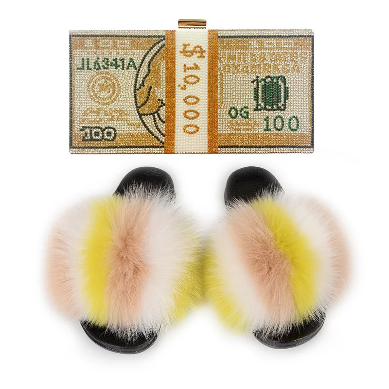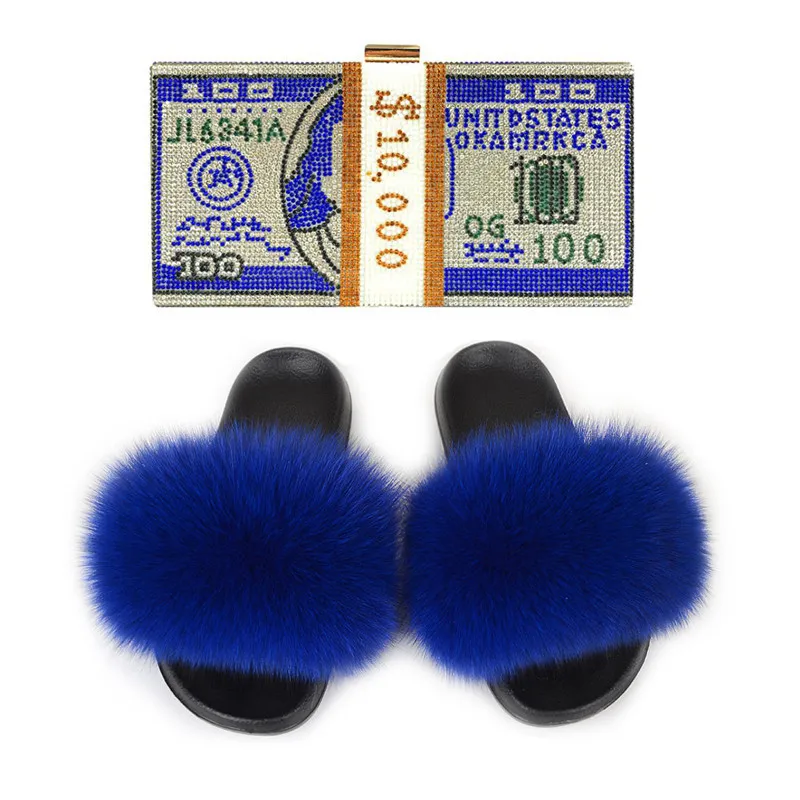 Женские тапочки из лисьего меха; Женские шлепанцы с пушистым мехом; Женская Роскошная обувь; Женские меховые сандалии; Модная сумочка в долларах; Комплекты сумок в долларах США