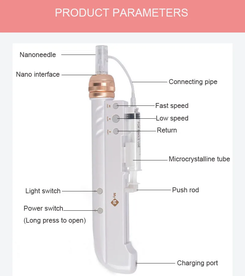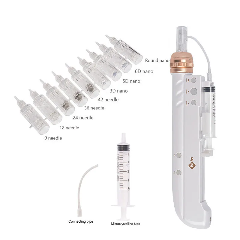 Технические характеристики-Адаптер: 5 В, DC1000MA-Источник питания: перезаряжаемый аккумулятор-Время работы/время (полная зарядка):2-3 часа/Беспроводная-Частота вибрации: 8000-10000r/m-Размер ручки: 23,5 см x 5 см-Био светильник: 7 цветов-Вес: основной корпус 165 гОписание товараЭто передовое микро-нужное устройство для кожи, которое работает для затягивания, подтяжки и омоложения кожи. Уникальный пружинный Наконечник иглы пера Derma использует автоматизированное needling движение, которое минимизирует боль и дискомфорт, в то же время лучше способствует равномерному поглощению местных сывороток, таких как PRP, гиалуроновая кислота, гидрогенный коллаген, витамин С и пептиды в кожу. Водный Электрический микроedle эффективно минимизирует размер пор.Технические преимущества:Красота воды = гиалуроновая кислота + множество вариантов красоты.Импорт косметических материалов и сопровождение их с безопасностью.Нехирургический, минимально Инвазивный, быстрый и легкий, готов к работе.Добавьте воду, чтобы эффективно пополнять щеки, губы, шею, грудь, заднюю часть руки и другие необходимые части воды.Для веснушек, темных кругов, акне, небольших пор, улучшает воспаление кожи.Улучшает упругость, улучшает на глазах, приподнимает провисание лица и шеи.Внимание к работе1. Игла не должна быть слишком жесткой, чтобы нажимать на кожу, чтобы не скользить в процессе, вызывая царапины.2. Используйте 75% спирт или УФ-стерилизатор для стерилизации картриджей иглы 5 минут.3. Время обработки половинки лица 15-20 минут, полное лицо 30-40 минут. Чувствительная кожа должна сократить время4. 7-15 дней/время лечения, всего 6 раз5. Обработанная нить, кожа слегка красная, затем апплицированная маска для лица может быть смягчена.6. Инструмент должен быть тщательно очищен после завершения обработки7. Под руководством профессионаловПосылка:1 х машина2 шприца2 x трубы2 x нано иглы1 х адаптер питания1 х USB кабель1 Инструкция пользователя1 x коробкаРегулировка 7 био-лампЗеленый светильникЭффект на седативные, успокаивающие и очищающиеКрасный светильникПомощь для тонких линий и морщинСиний светильникПомощь при акне/воспалении кожи, противовоспалительноеЖелтый светильникРазлагаемый пигмент, улучшает шероховатую кожуФиолетовый светильникРемонт акне/шрамГолубой светильникПостепенное увеличение энергии клетокЛазерный светильник, мягкий светильникГлубоко проникает в кожу, ускоряет метаболизм активных тканей разложения цветовых пятенЕсли вы хотите купить иглы, пожалуйста, нажмите здесь!Смотрите так же другие товары: