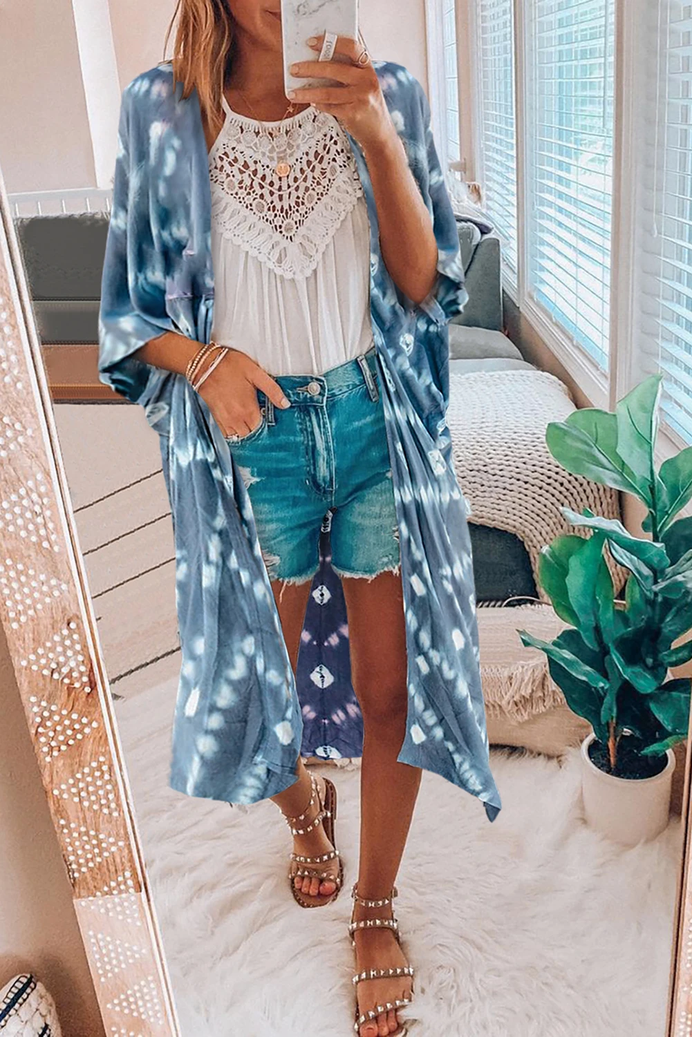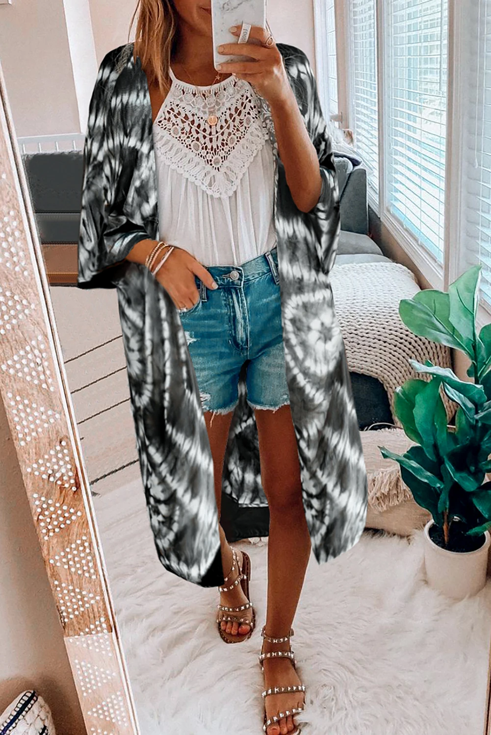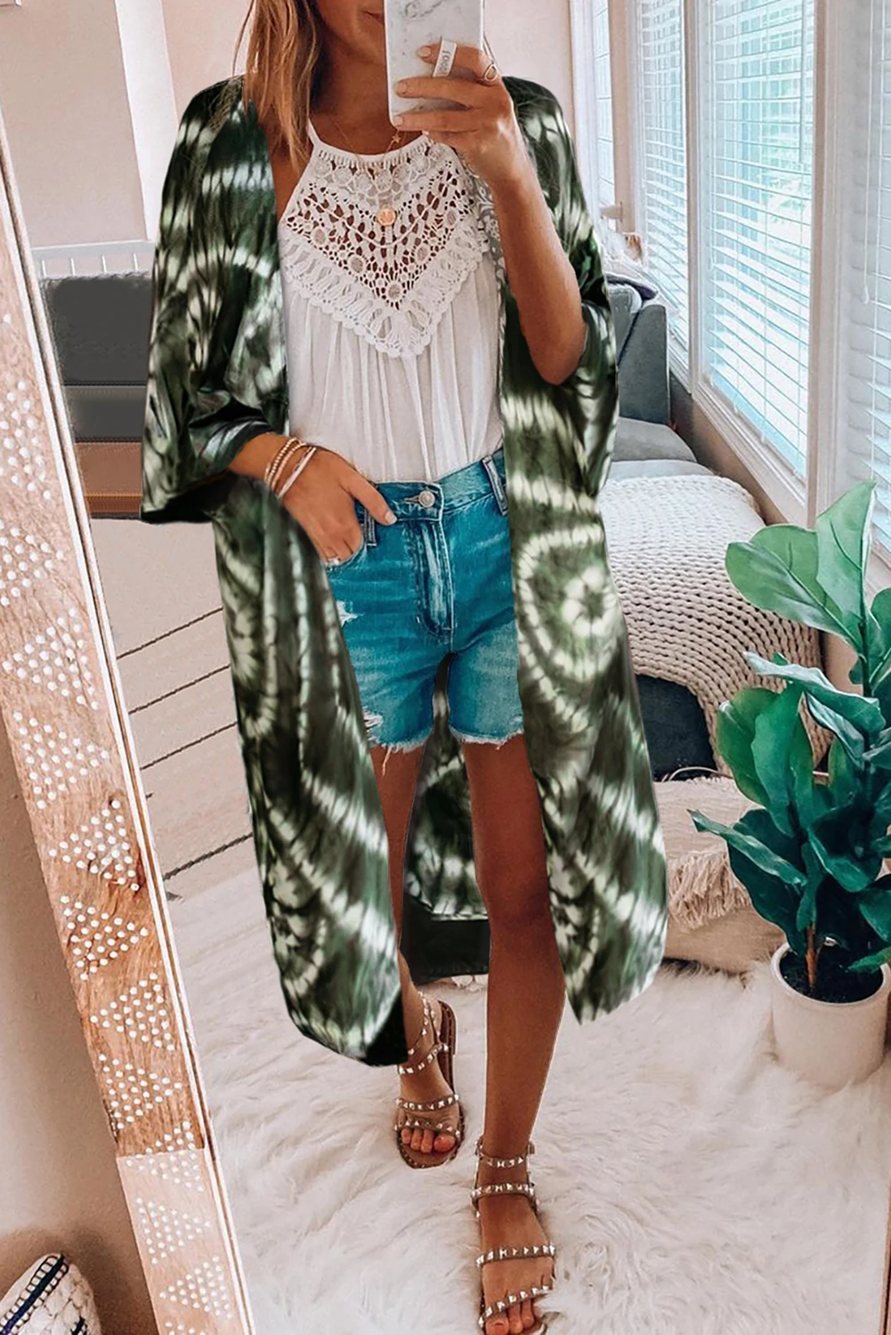 Небесно-голубой/черный/зеленый рукав «летучая мышь» Модный кардиган с принтом с галстуком-краской, накидка, топ, летние женские изящные свободные пальто с открытой передней частью