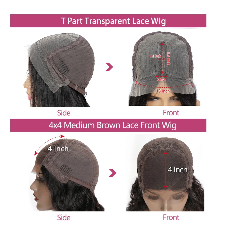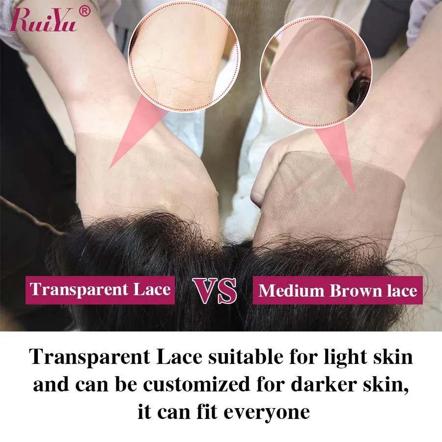 Бренд: RUIYU Материал волос: 100% натуральные человеческие волосы Длина волос: 8-26 дюймов в наличии (Как измерить: волосы необходимо растянуть, чтобы они были прямыми, чтобы измерить длину от вращения головы до самых длинных волос на кнопке) Линия волос: предварительно выщипанная натуральная линия волос Цвет волос: натуральный черный цвет, можно окрашивать/отбеливать/рестайлировать по своему усмотрению Размер шнурка: T часть/4 дюйма * 4 дюйма Цвет кружева: прозрачное кружево/средне-коричневое кружево Размер Кепки: средний размер