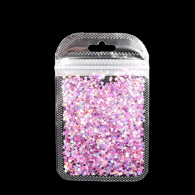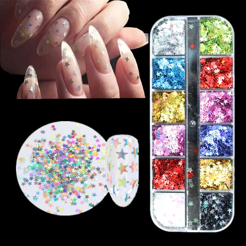 1 пакет из 9 цветов лазерных блестящих пятиконечных звездочек для ногтей: [Название продукта]: 3D лазерная вспышка для дизайна ногтей AB Серебряный Порошок [Характеристики продукта]: ультратонкая пятиконечная звезда с различным цветным лазером [Цвет товара]: 9 разных цветов [Содержание нетто продукта]: около 3 г [Упаковка товара]: 1 сумка [Размер]: около 8,0*5,0*2,0 см [Особенности продукта]: Удалите поверхность ногтя пинцетом и используйте его в качестве украшения ногтей