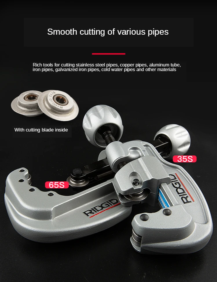 RIDGID предназначен для труб из нержавеющей стали, стальных труб, латунных режущих резцов, может эффективно и легко высокого качества для завершения различных твердых труб резки, 35S Диаметр резца резки 6-35 мм, толщина стенок труб менее 3 мм Диаметр резца 65S для резки труб 6-65 мм, Толщина стенок труб менее 3 мм. Процесс резки прост и разрез не гладкий. Американский Ридж (RIDIGID)